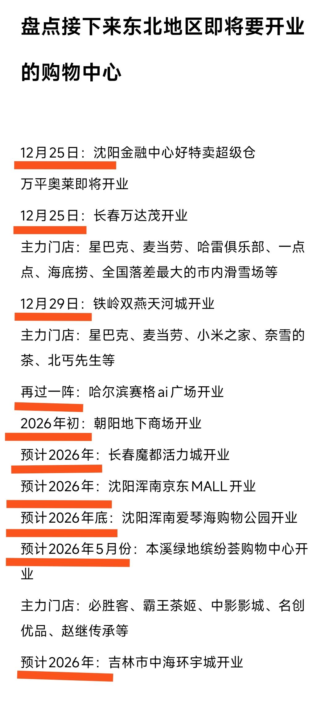 沈阳万平奥莱、长春万达茂、铁岭双燕天河城购物中心在2025年底接连开业,之后哈尔滨赛格广场与朝阳地下商场也会陆续开业。 可以说纵观2025年底与2026年大家会发现沈阳、长春的商业发展势头是最好的。大连星海广场的万象城是大家最期待的,除此之外并没有大型购物中心正在建设。 令人欣慰的是看到铁岭、朝阳、本溪、吉林等东北四五线城市在商业发展方面即将取得新突破还是挺令人欣慰的,这样的话可以让消费真正的留在当地。