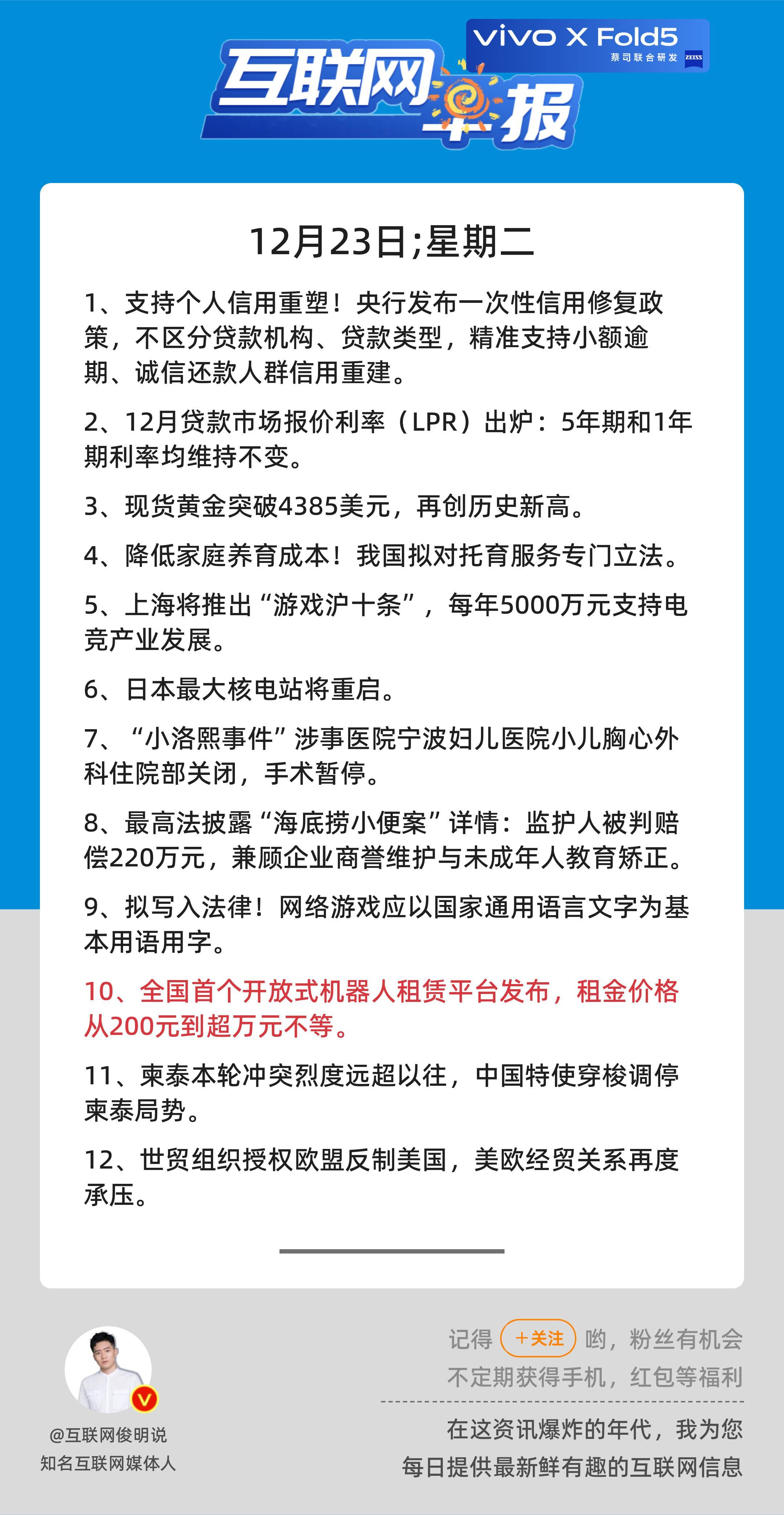 12月23日,星期二,《第2996期》;互联网早报,众览天下事关心第10条:全国首个开放式机器人租赁平台发布,租金价格从200元到超万元不等;早安————————————点击右上方关注每天一分钟众览天下事,互联网早报值得拥有! 更多精彩,欢迎加入粉丝群俊明和他的朋友们