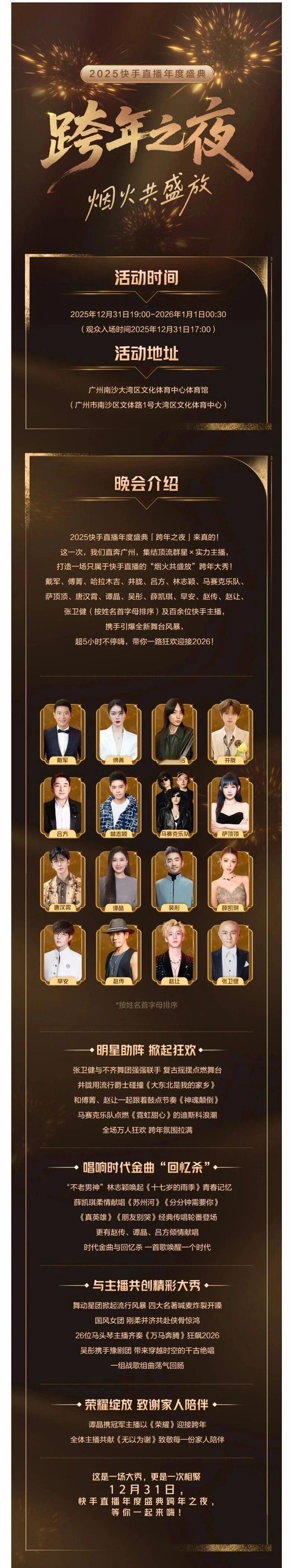 【南沙又来演唱会!快手直播跨年盛典定点南沙湾体】不用等明年!南沙再迎来大型演唱会。快手直播跨年盛典官宣将在南沙大湾区文化体育中心体育馆举办!具体时间为2025年12月31日19:00-2026年1月1日00:30。 目前公布的票价也十分实惠,从最低的138元,198元,298元,最高也只要398元。 官方介绍2025快手直播年度盛典「跨年之夜」来真的!这一次,我们直奔广州,集结顶流群星x实力主播打造一场只属于快手直播的“烟火共盛放”跨年大秀!戴军、傅菁、哈拉木吉、井胧、吕方、林志颖、马赛克乐队、萨顶顶、唐汉霄、谭晶、吴彤、薛凯琪、早安、赵传、赵让、张卫健(按姓名首字母排序)及百余位快手主播,携手引爆全新舞台风暴,超5小时不停嗨,带你一路狂欢迎接2026! 从介绍看来,明星阵容还算可以,而且看来还会有跨年烟花秀的意思。