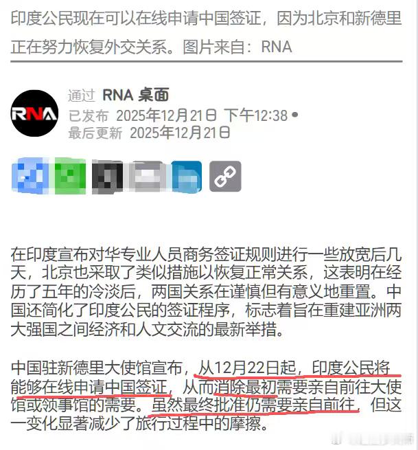 12月22日起,中国放宽对印度人入境的签证程序,可在线申请,仅最终批准要当面办理。印度RNA(研究新闻分析社)报道:中国驻新德里大使馆宣布,从12月22日起,印度公民将能够在线申请中国签证,从而消除最初需要亲自前往大使馆或领事馆的需要。虽然最终批准仍需要亲自前往,但这一变化显著减少了旅行过程中的摩擦。原文标题(Indians Can Apply For Chinese Visas From Dec 22; Beijing Eases Rules After India Relaxed Business Visa Norms)每天摸鱼打卡