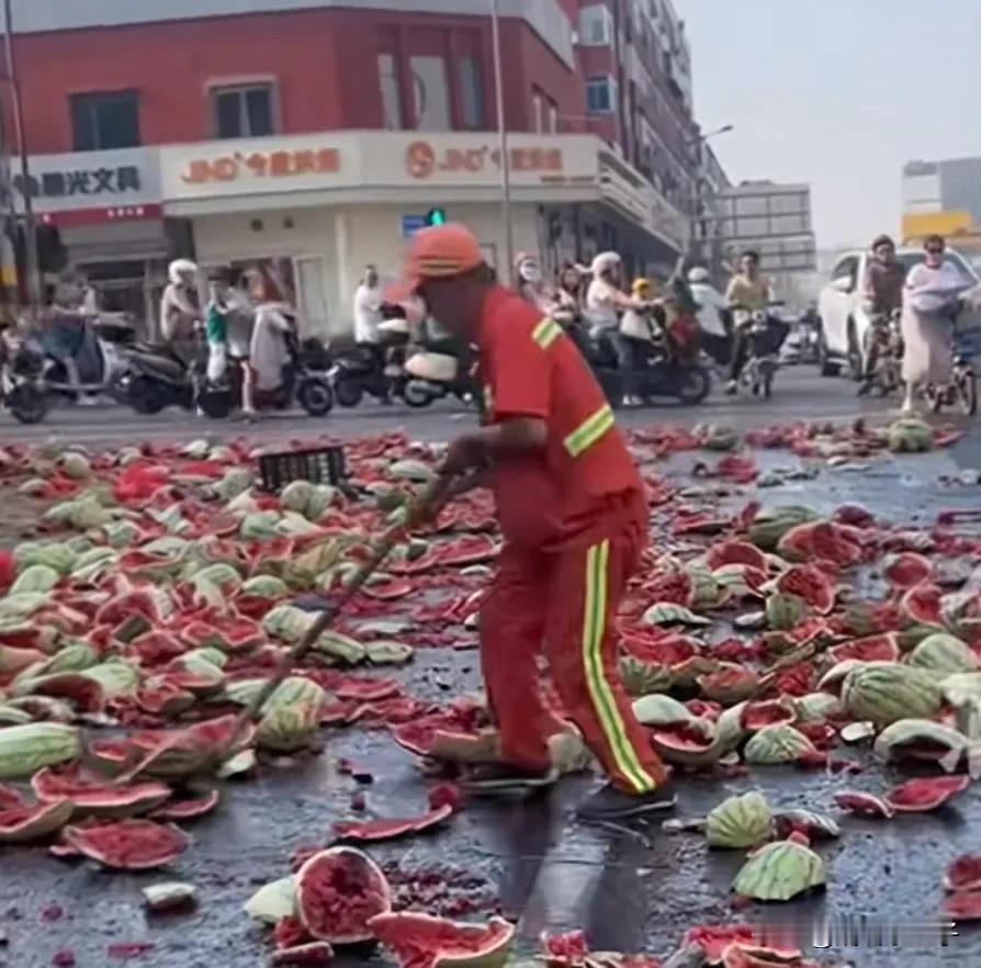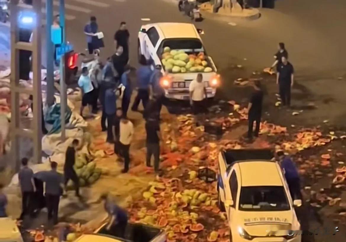 山西太原城管执法惹怒了商贩 两者一个用车拉西瓜 一个用力摔西瓜 你们双方是发泄的一通 可是有谁为无辜的环卫工人想过吗 他们一大早起来就要面对一片狼藉的街头 环卫工人有什么错太原城管凌晨执法 太原卖瓜商贩砸西瓜 山西太原城管与卖瓜商贩 太原城管收西瓜摊