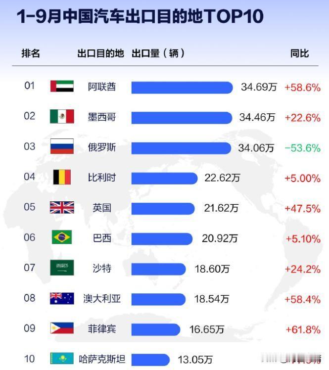 1-9月中国汽车出口目的地前三名 1. 阿联酋:出口量34.69万辆,同比增