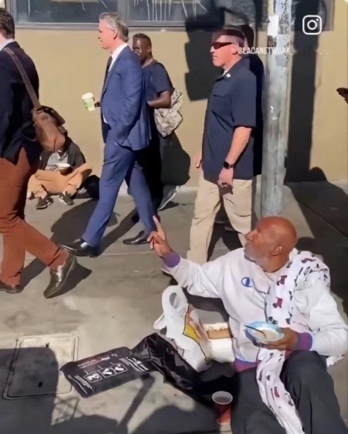 加州州长纽森手拿一杯咖啡,西装革履的在保镖簇拥下,从一群流浪汉中间穿过。正逢美国