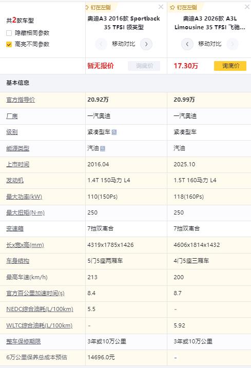 奥迪A3新旧款对决:5.69万二手还是20.99万新车更值? 当奥迪A3 2016款Sportback 35 TFSI领英型以5.69万的一口价摆在面前,对比20.99万的2026款A3L Limousine 35 TFSI,预算跨度超15万的选择难题随之而来。从核心配置差异到长期使用成本,两款车的定位差异显著,选新还是淘旧,关键在于用车需求与风险承受能力。 动力与空间层面,2016款搭载1.4T 150马力发动机,匹配7挡双离合变速箱,8.4秒破百的成绩略优于2026款1.5T 160马力车型的8.7秒,213km/h的最高车速也更有优势,5.5L/100km的NEDC油耗兼顾经济性。而2026款作为三厢加长车型,4606mm的车长较2016款两厢版多出287mm,轴距优势带来更宽敞的后排空间,更适合家庭使用,5.92L/100km的WLTC油耗虽略高,但符合当下排放标准。 安全配置是两者差距的核心。2016款仅标配车道偏离预警和胎压显示,主动刹车、并线辅助均需额外付费选装,其中并线辅助选装价5000元;被动安全上,后排侧气囊需1800元选装,缺失前排中央安全气囊。2026款则全面升级,主动安全预警系统新增前方碰撞、倒车车侧预警,主动刹车、并线辅助、疲劳驾驶提示均为标配,被动安全补齐前排中央安全气囊,胎压报警虽不及胎压显示直观,但安全配置的完整性大幅提升。 辅助操控配置方面,两款车均标配倒车影像和定速巡航,但2026款新增全速自适应巡航,自动泊车入位从2016款1400元的选装变为标配,还提供运动和个性化驾驶模式选择。2016款若想升级360°全景影像需花费6000元,自适应巡航选装价高达12000元,全套选装后配置成本显著增加,且未必能达到新车的集成度。 成本层面,2016款5.69万的低价极具吸引力,但需承担隐性风险:该车已超原厂质保,6万公里保养总成本预估14696元,且10年车龄的EA211发动机和干式双离合可能存在烧机油、离合器磨损等通病。2026款虽初始投入高,但享受3年或10万公里质保,初期保养成本可控,且无前任使用痕迹,车况更有保障。 导购建议层面,预算有限、短期过渡或新手练手的消费者,若能通过第三方检测确认2016款无重大事故、发动机变速箱状态良好,5.69万的价格可低成本获得豪华品牌体验,但需预留维修基金。而追求长期稳定、注重安全配置和空间实用性的家庭用户,2026款的全面配置升级和质保保障更值得选择,即便初始投入更高,也能规避老旧车型的维修隐患。最终选择的核心的是:若看重性价比与短期使用,车况靠谱的二手款可入手;若追求省心与长期价值,新车才是更稳妥的选择。【来自懂车帝车友圈】
