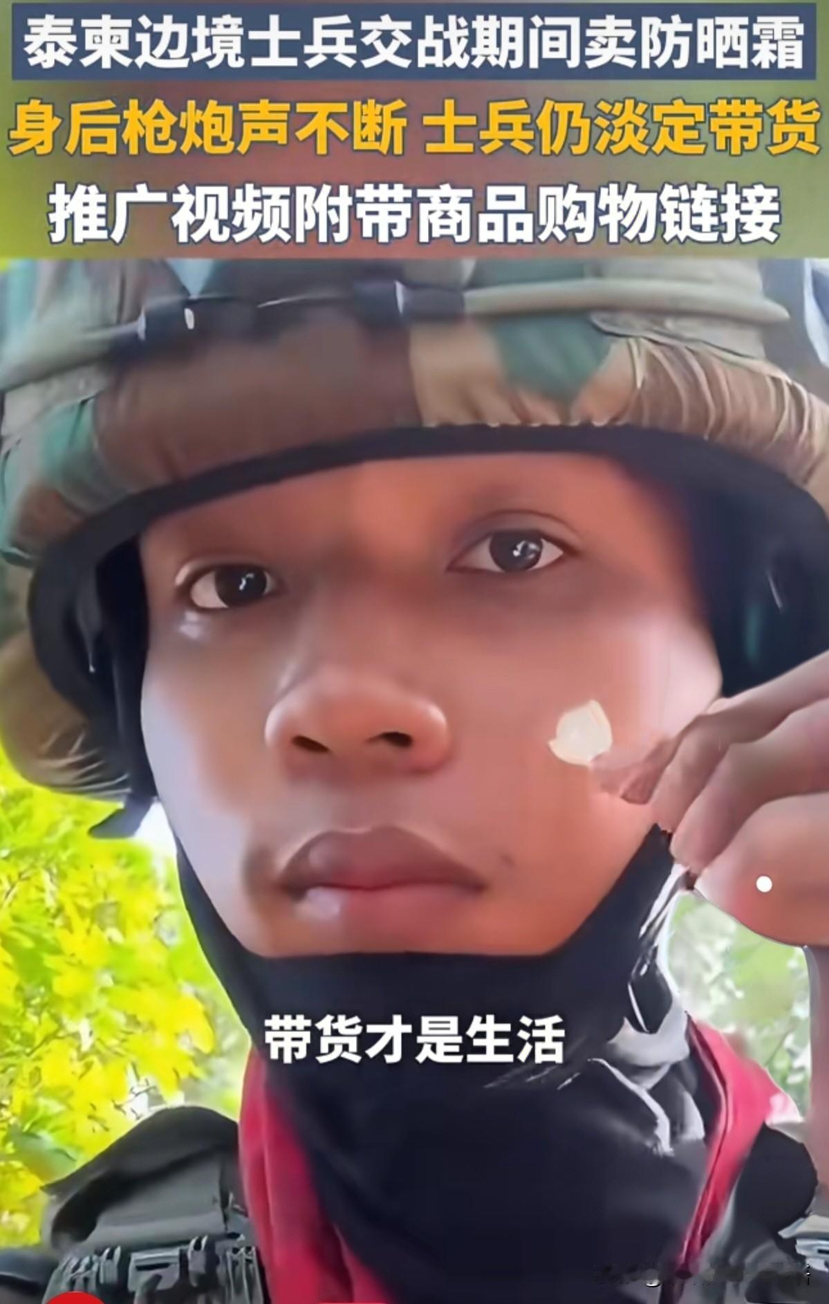当你抱怨工作环境不好的时候,看看卖防晒霜的泰国士兵。 身后的炮弹声不停的轰鸣着,而他淡定的在脸上涂抹防晒霜。 原来他是受雇卖防晒霜,看来带货才是正经工作,打仗只是做兼职。