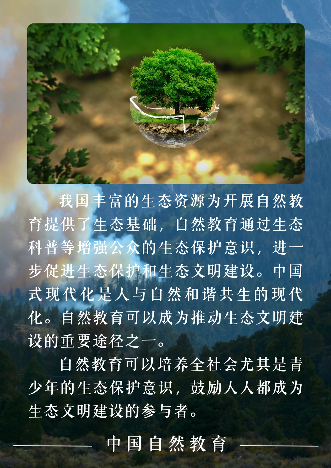 我国丰富的生态资源为开展自然教育提供了生态基础,自然教育通过生态科普等增强公众的生态保护意识,进一步促进生态保护和生态文明建设。中国式现代化是人与自然和谐共生的现代化。自然教育可以成为推动生态文明建设的重要途径之一。 自然教育可以培养全社会尤其是青少年的生态保护意识,鼓励人人都成为生态文明建设的参与者。