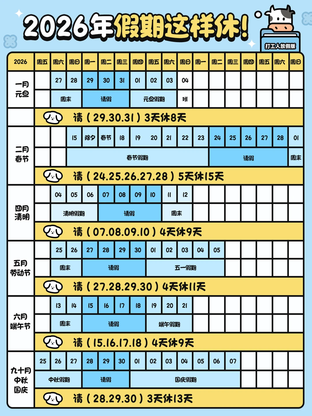 2026年假期这样休! 收获6个长假期哦~ 一月元旦:请(29.30.31)3天休8天 二月春节:请(24.25.26.27.28)5天休15天 四月清明:请(07.08.09.10)4天休9天 五月劳动节:请(27.28.29.30)4天休11天 六月端午:请(15.16.17.18)4天休9天 九十月中秋+国庆:请(28.29.30)3天休13天 还附带请假理由! 这下谁都不能阻止我放长假啦~