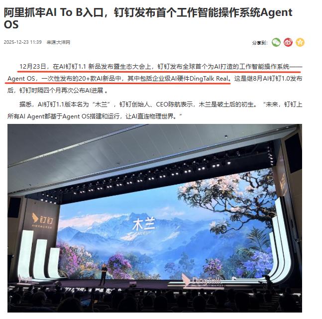 领先一步!钉钉发布全球首个AI工作操作系统,这次终于不是国外巨头主导生产力变革了! 12月23日,AI钉钉1.1正式发布。不同以往的是,这次钉钉彻底变了,推出了全球首个为AI打造的工作智能操作系统AgentOS。这意味着我们开启了“人与AI协同”的全新工作方式,以后用户只需与一个入口说话,就有一整个"AI团队"帮你干活。 说简单点,以前用钉钉,是你追着功能跑;现在用钉钉,是你发号施令,AI团队追着任务跑。 比如以前规划差旅,你得自己查车票、比酒店、发行程,一步都不能少。现在打开钉钉,对着统一入口说一句"帮我规划明天去上海的差旅,预算2000内,靠近客户公司",背后的通用Agent"悟空"就会自动搞定所有流程,从订票到分享行程,全程不用你动手。 而且不管你用电脑、手机,甚至公司的智能硬件,打开钉钉都是同一个熟悉的入口,不用重新适应操作。像蒙牛牧场的巡查员工,现在随口说几句话,AI表格就自动填好了,不用再对着复杂界面慢慢录入,对不擅长用科技产品的长辈同事也特别友好。 钉钉CEO无招说,“过去的钉钉本质是为人设计的,基于人与人、人与系统,而现在钉钉为Agent打造,帮助AI连接物理世界”。这句话听着不太好理解,实际感受就是:AI不再是藏在各个角落的小工具,而是能跟你协同干活的伙伴。 而且这次钉钉还一口气出了20多个新品,比如能让AI安全执行任务的专属硬件,还有能一键把订单图片转成排产表格的制造业Agent,不管是普通职场人还是企业老板,都能找到对应的便利。 想想以前在移动互联网时代,国外巨头把操作系统、芯片架构这些底层能力牢牢占据,我们一直在追赶。而如今,我们逐渐建立起了AI时代的工作智能操作系统,开始领先国外了。