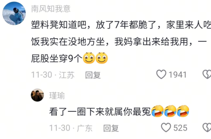 塑料凳知道吧,放了7年都脆了,家里来人吃饭我实在没地方坐,我妈拿出来给我用,一屁股坐穿9个。