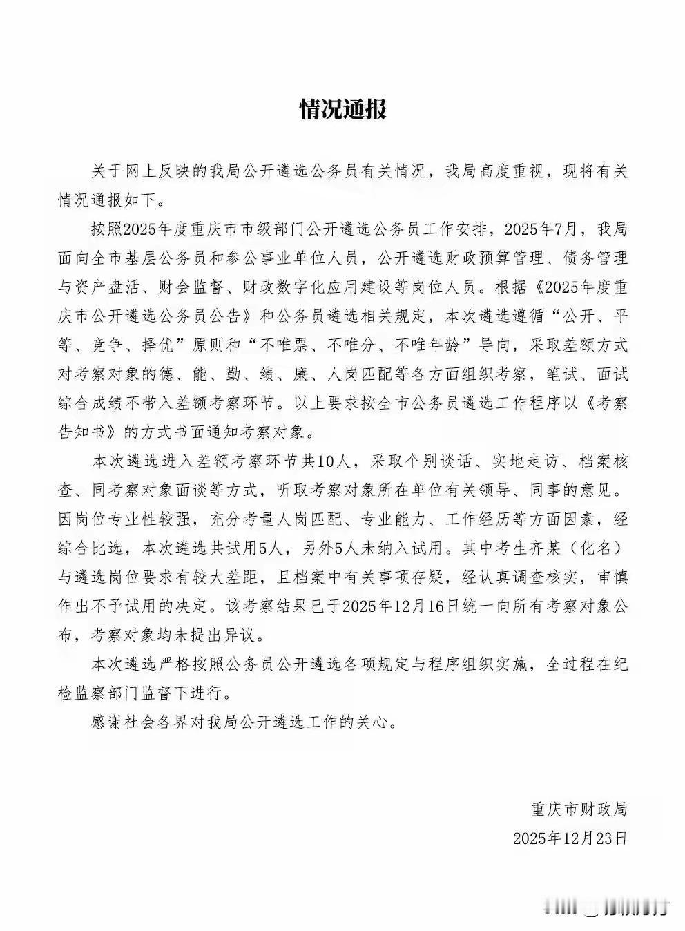 重庆市财政局选拔公务员,有位齐先生笔试、面试成绩均为第一名却被淘汰,官方对此的解释是齐某“与遴选岗位有较大差距”。按说一个岗位需要什么条件的员工,单位当然更有发言权,但是笔试面试都是第一却和要求差距较大,是不是说明考试内容本身就不合理?如果说笔试是统一安排不便改动,那么面试就应该有针对性地安排业务考查,这样才能选出最合适的人才。安排考试却另有选取标准,那么考试又在起什么作用呢?遴选公务员