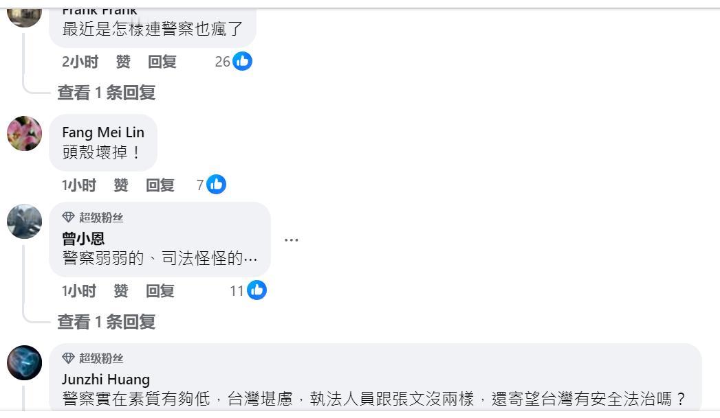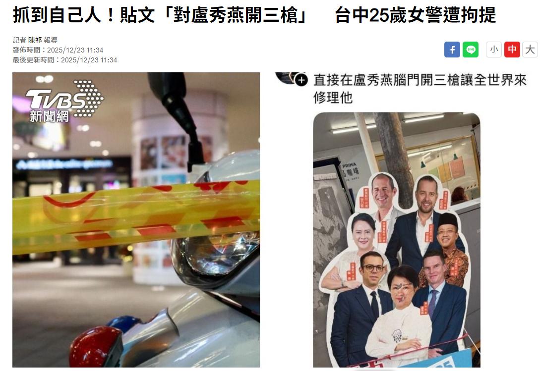 岛内震惊!恐吓的竟然还有女警....... 台湾省台北捷运本月(19)日刚发生骇人听闻的袭击事件 ,造成社会恐慌和不安。事后网上流传许多恐吓贴文,而有人在网上说“直接在卢秀燕脑门开三枪”,引起关注,一查竟是台中第二警分局的女警。 呵呵,在台独团伙的带领下,岛内人的撕裂仇恨到这种程度了。