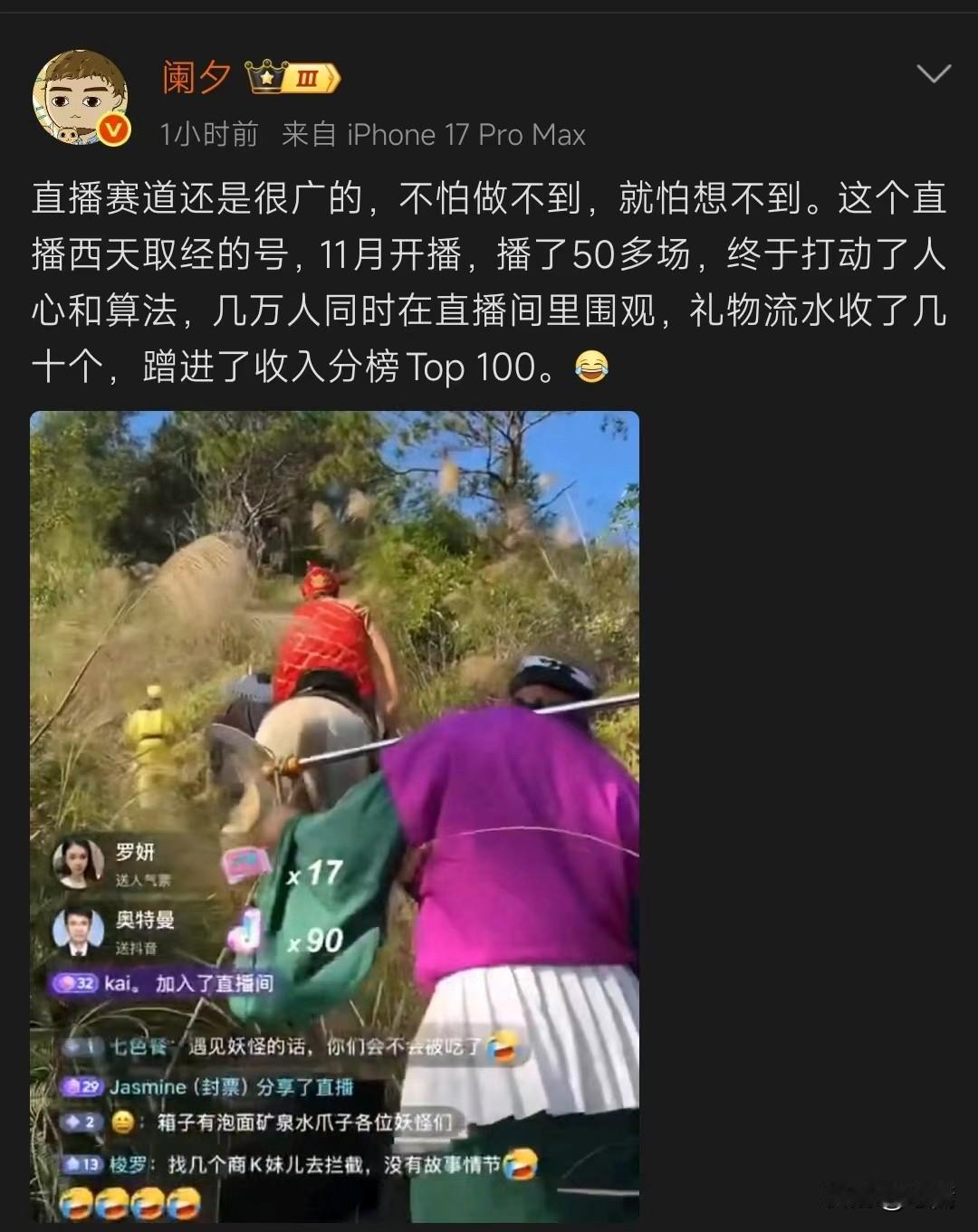 看来求取真经契合很多人内心的情感需求啊! 既然西游记直播开了头,下一步就三国演义、红楼梦和水浒传轮番上播了吧? 流量的江湖里,不要说做不到,就看你想不想得到,愿不愿意抢先一步做到啊!