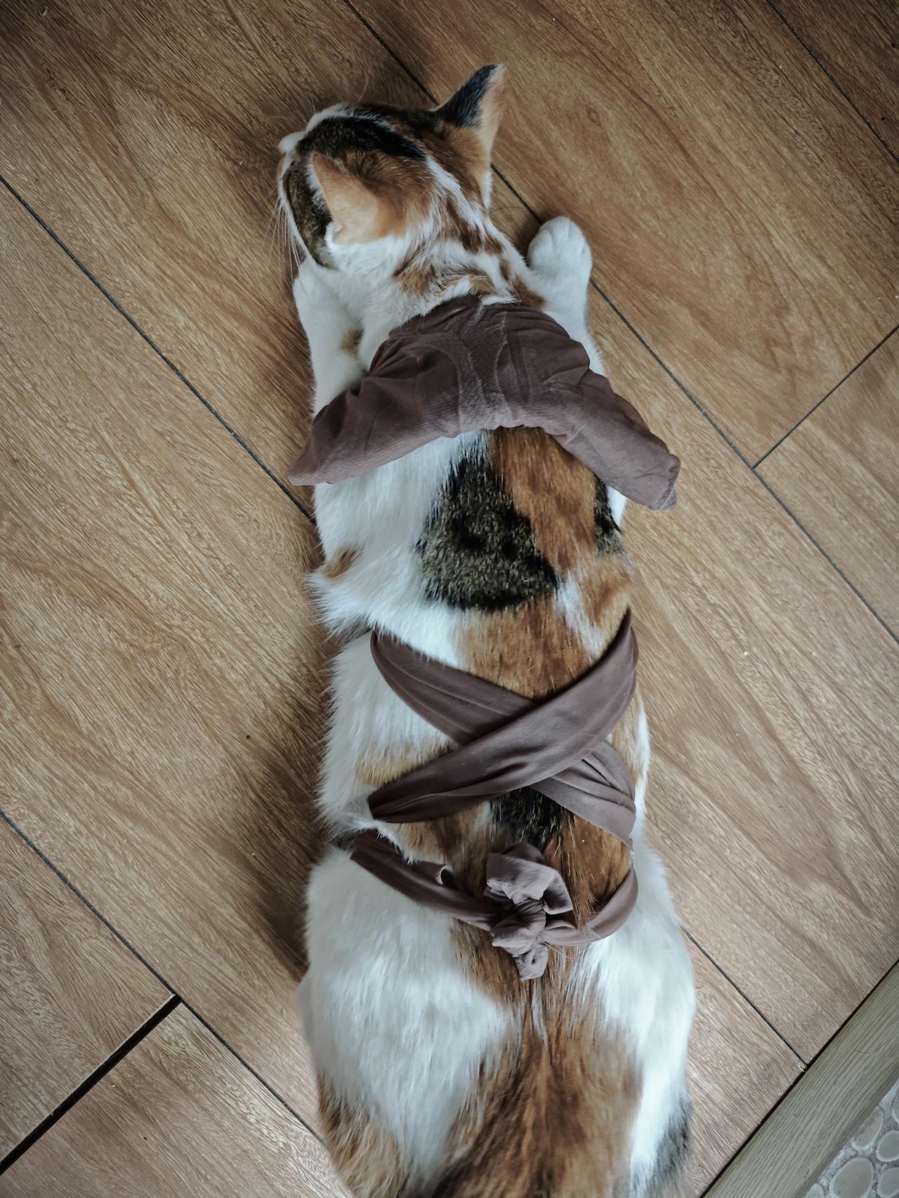 这小猫还不到三个月大,三糖又开始发情了,一直哼哼唧唧的闹着要出去,看她太难受了,去买了条丝袜,按照网上说的给它绑了,是稍微能有点用,想着等这一阵过去了带她去绝育吧。 这小动物发情太难受了,它自己又处理不了。[流泪]