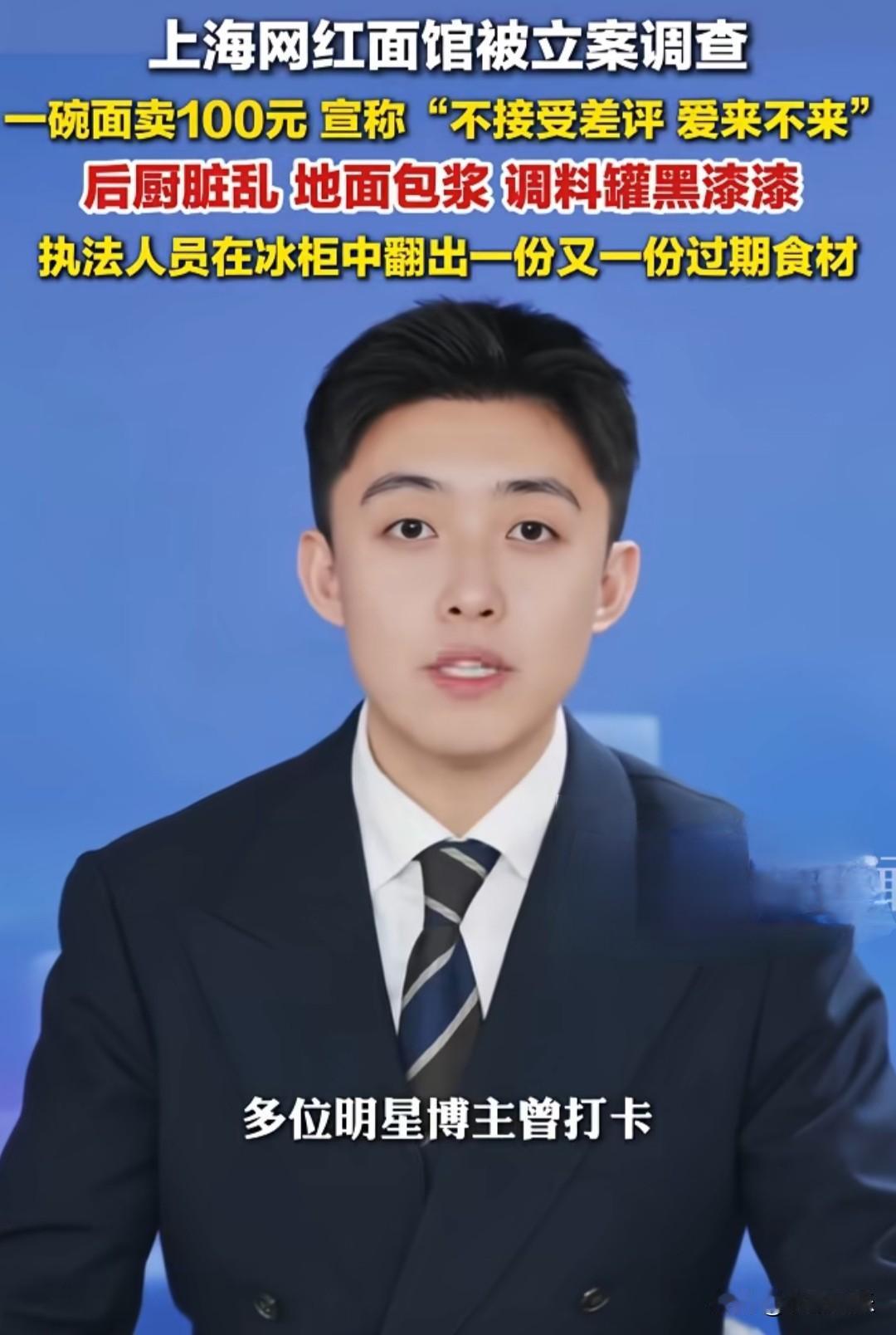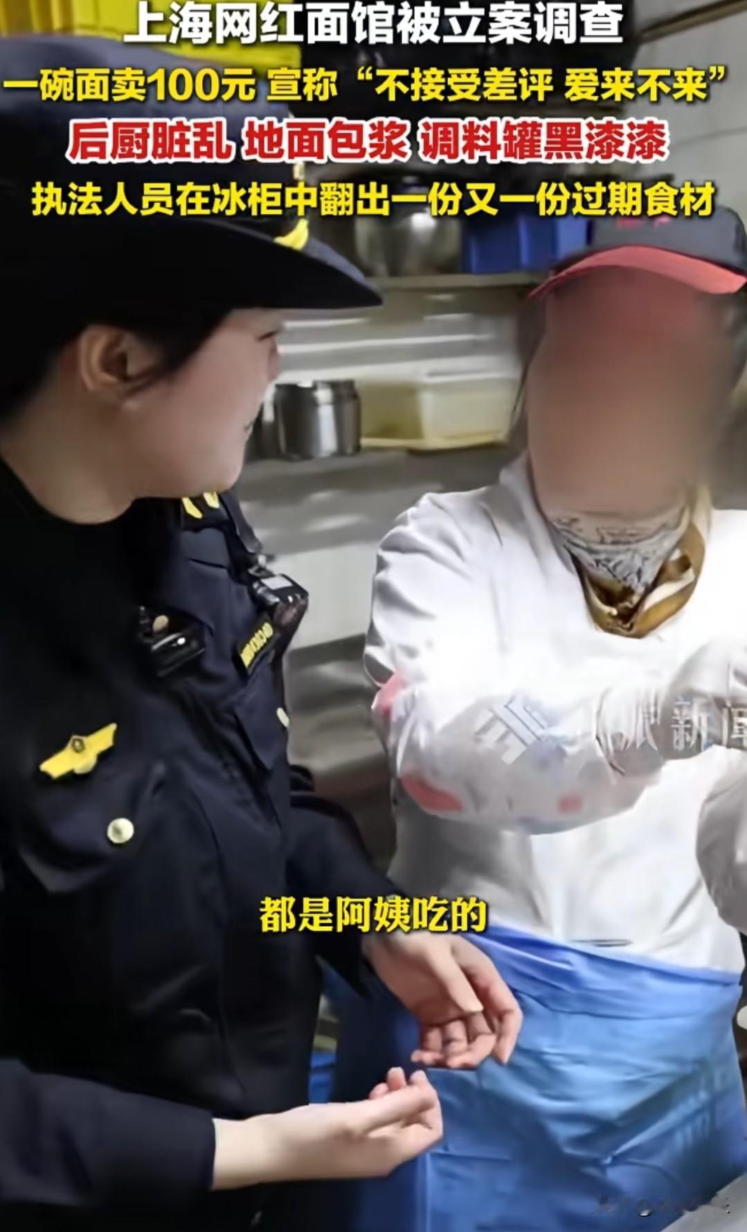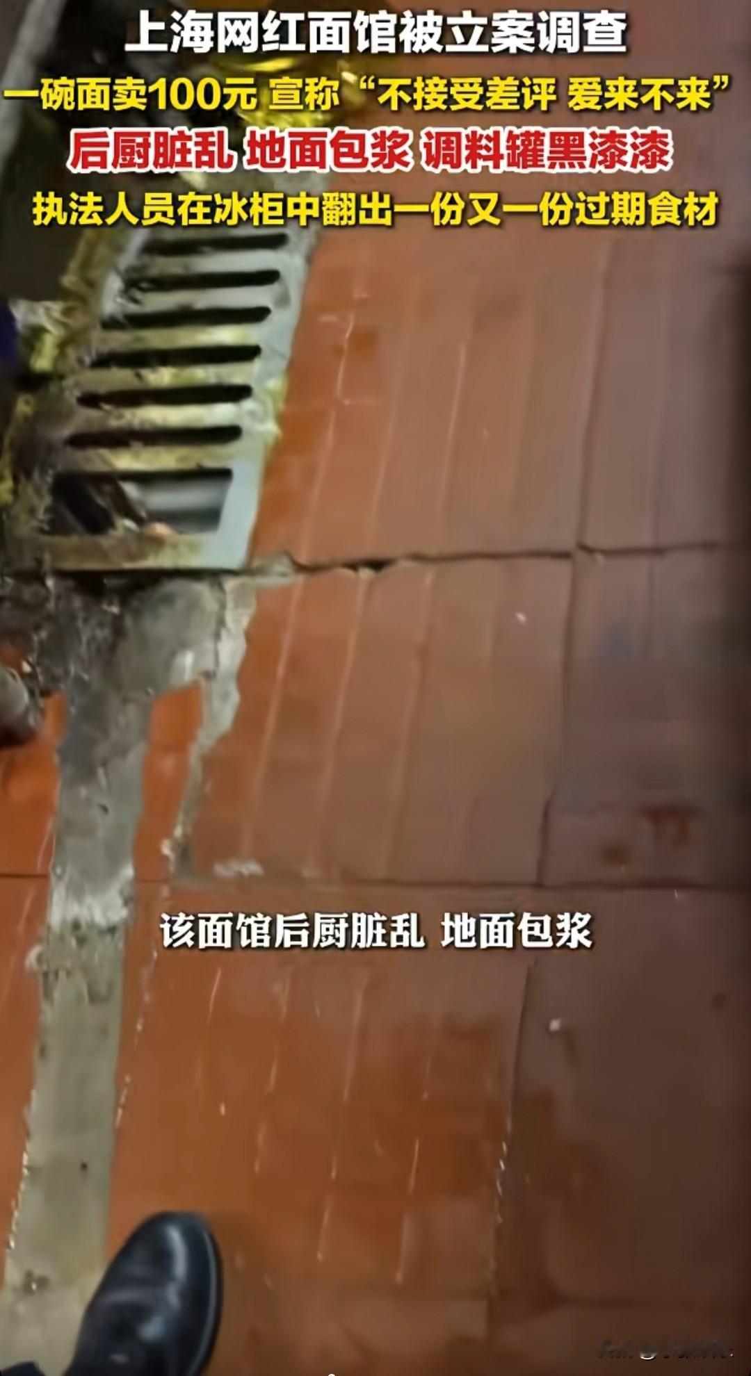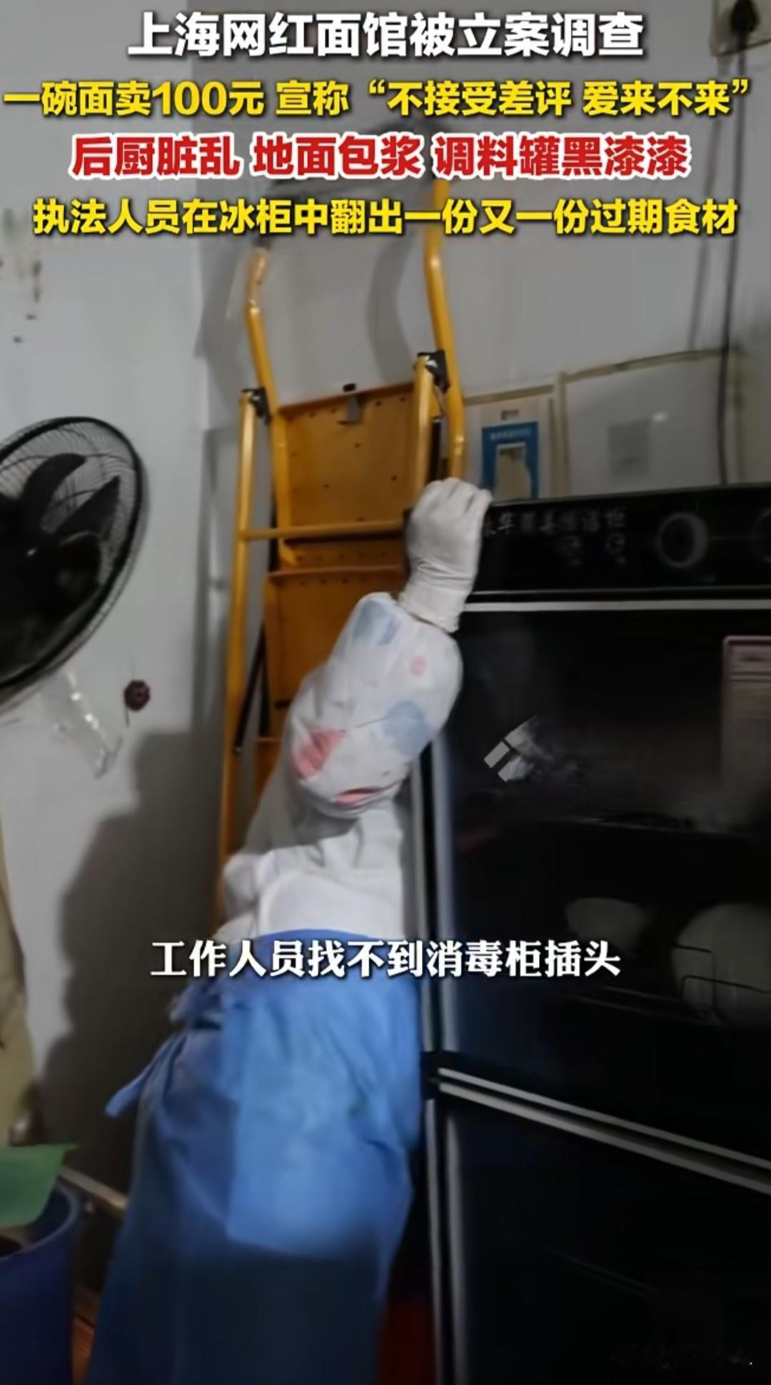 一碗黄鱼面敢卖到上百元,还嚣张放话“不接受差评、爱来不来”——上海徐汇那家火遍社交平台的明呈黄鱼面馆,靠着这股“拽劲儿”圈了一波粉,监管部门突击检查后,直接撕下了这家店的网红遮羞布。 执法人员一踏进后厨,眼前的景象就让人头皮发麻:地面油腻得能粘住鞋底,调料罐上的污垢厚得都看不出原本颜色,消毒柜被挪了位置,插头孤零零地甩在一边,早就成了摆设。 冰柜里还藏着变质番茄、过期香干和豆腐,一堆没贴标签的咸菜、过期10天的拉面也混在里面。这些乱七八糟的玩意儿,全被做成浇头端上了顾客的餐桌。 面对质问,店员支支吾吾找借口,一会儿说是员工餐食材,一会儿又甩锅给工人私人物品,说辞前后矛盾,简直把人当傻子糊弄。 这家店的离谱程度远不止后厨脏乱。招牌黄鱼面卖55元,高端款直接冲上百元,价格贵得离谱,却连最基本的食品安全都守不住。 早就有网友吐槽,在店里吃出蟑螂,还撞见厨师对着锅具打喷嚏。店家非但不整改,反而靠着“拽脾气”人设博眼球,把傲慢刻在了骨子里。 徐汇区市场监管局已经对这家面馆立案调查。使用过期食材按法规最高能罚10万元。监管部门也明确表态,网红店不是监管盲区,会被盯得更紧。这场闹剧给所有网红餐饮敲了警钟:靠营销耍横只能火一时,守住食品安全的底线,才是长久经营的硬道理。