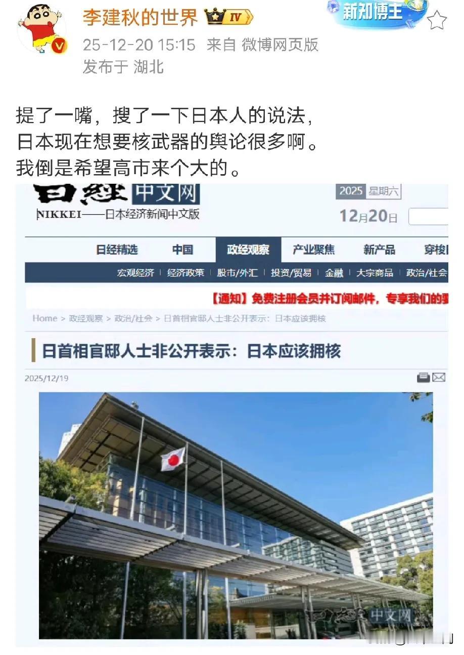 现在日本要拥核的呼声很高,高市早苗也蠢蠢欲动,准备改无核三原则,为日本拥核做铺垫! 经常看到很多精日的公知说如果允许日本造核武器,日本三个月就可以造出来原子弹!我觉得都太高看日本人,首先美国人就不会允许日本拥核,现在日本的核电站的核原料全都是带摄像头的,美国随时都看得到,美国防日本防得更严格,其次把日本的工业能力夸大了,日本至今连火箭都还没发射成功过,日本还声称要造五代机,现在连个影子都没有,最后日本就算要造,它去哪里实验,就凭日本这样的地理位置,他要去哪里实验,只要它实验,一定第一时间会被知道的,我们更有借口打它了,直接原子弹就扔过去了!