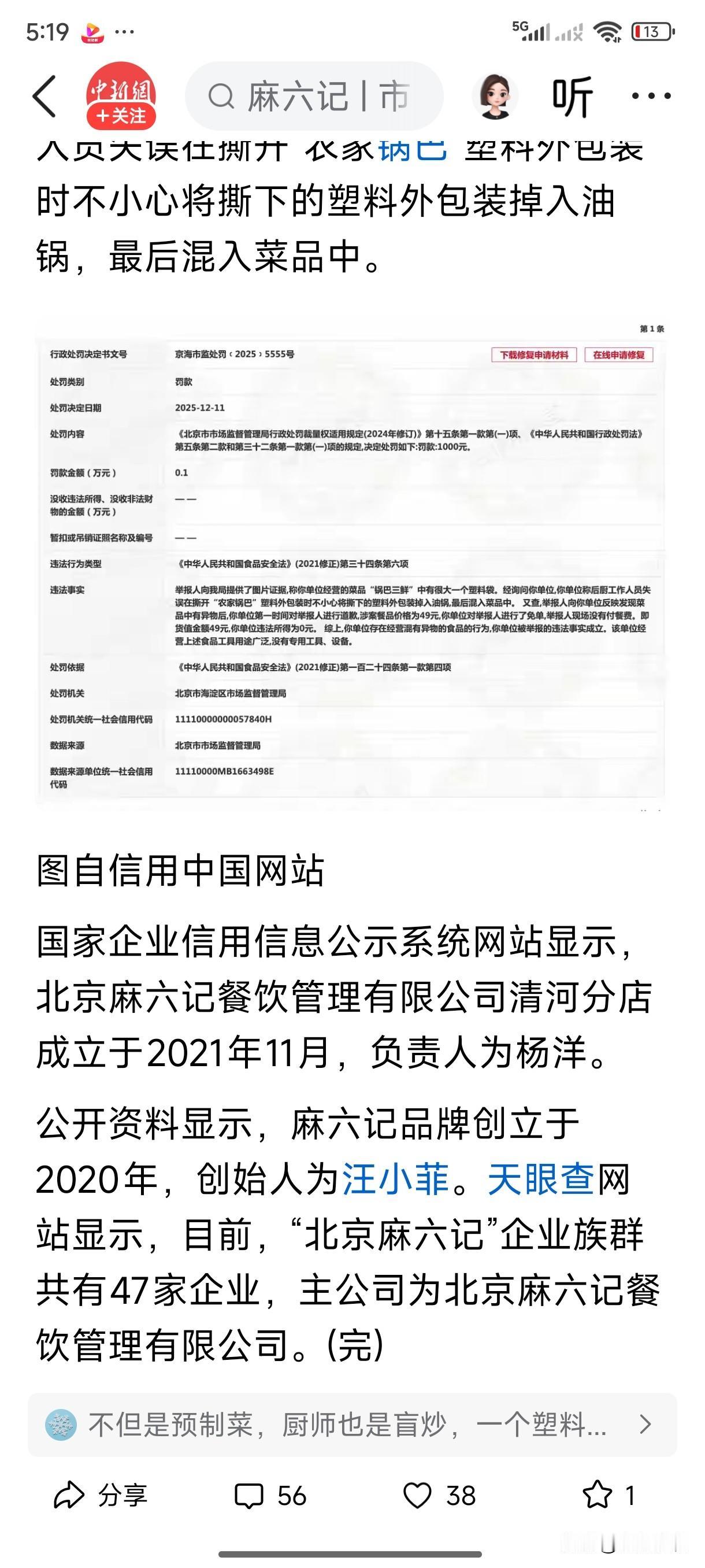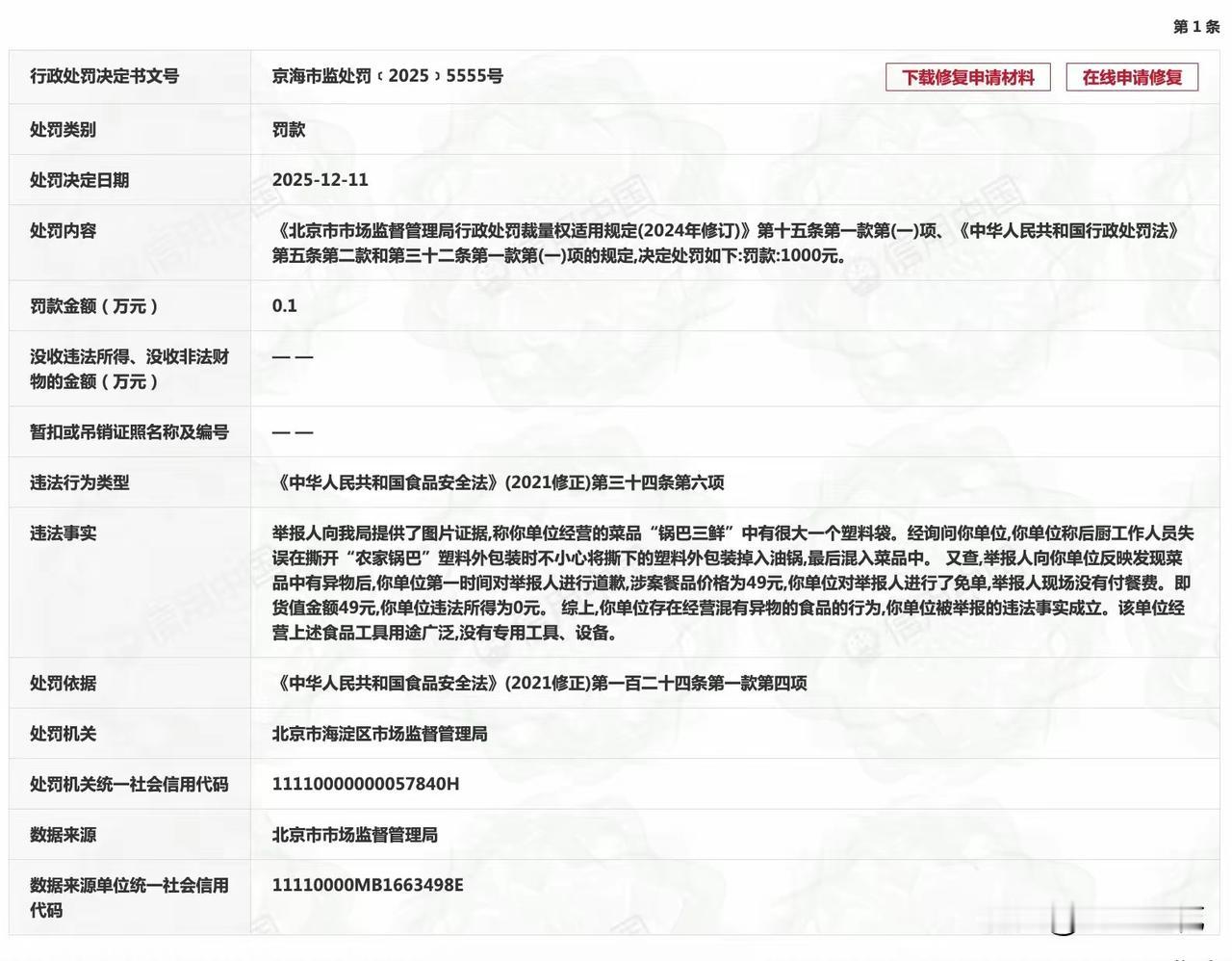麻六记北京清河分店因违反食品安全法,被处罚了。 食品安全关乎国人身体健康!所以必须严抓。 麻六记清河分店菜品“锅巴三鲜”有很大一个塑料袋,原来是后厨撕开“农家锅巴”塑料外包装袋时,不小心把塑料外包装袋掉入油锅,混入菜品中了。 这塑料袋过油后会不会有毒?如果里面是一个小蟑螂咋办?麻六记那么高大上的,咋能出这么低级的地边摊操作?罚款1000元是不是太轻了?那岂不是九牛一毛,不足以引起麻六记大老板的重视,这个顶包倒霉蛋工资可能又要被扣1000了吧? 品牌创立虽不易,但不能只为了自身利益,不顾及食品安全和品质,终究走不远。