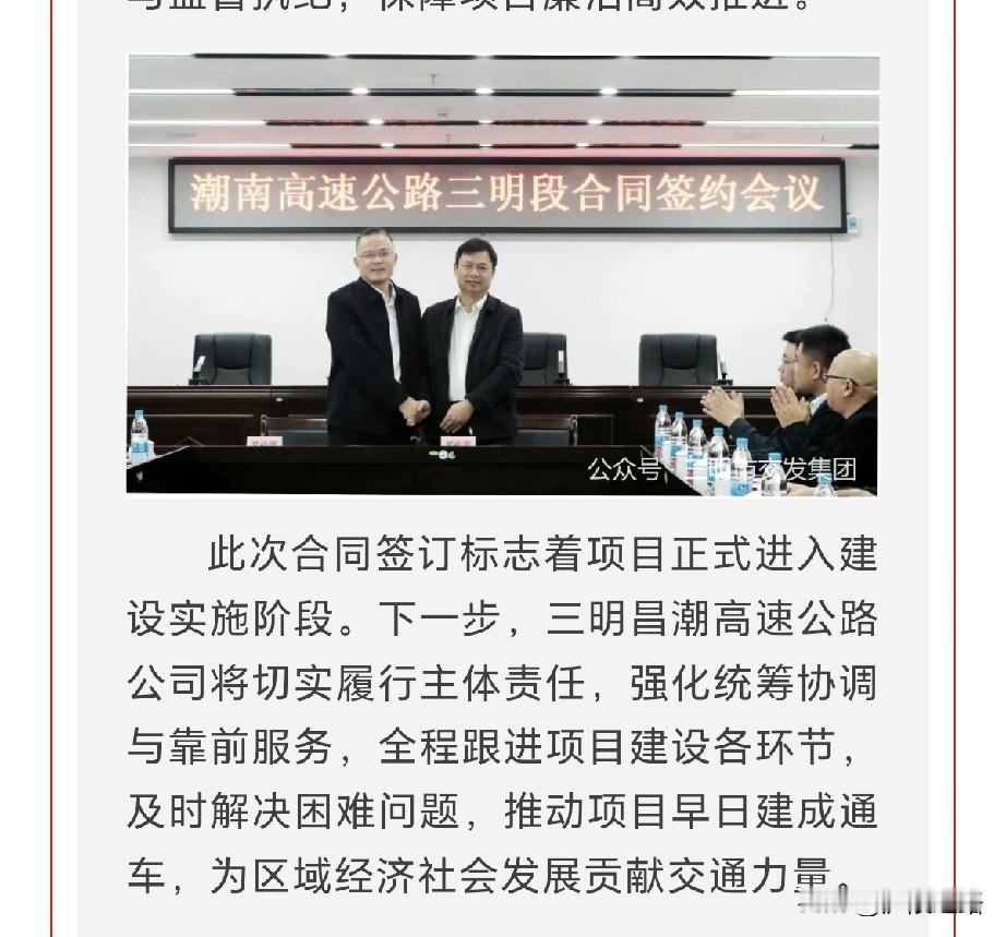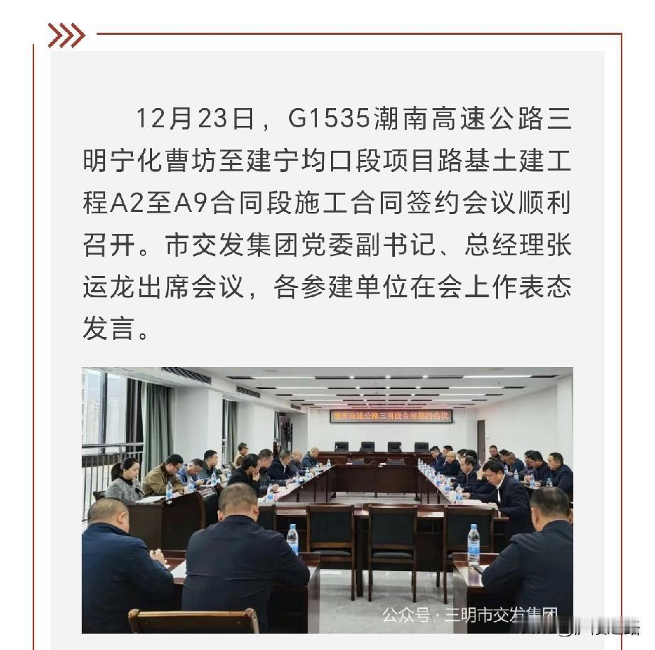 好消息,潮南高速公路三明段新进展,施工合同正式签约。 近日,G1535潮南高速公路三明宁化曹坊至建宁均口段项目路基土建工程A2至A9合同段施工合同签约会议顺利召开。 此次合同签订标志着项目正式进入建设实施阶段。下一步,三明昌潮高速公路公司将切实履行主体责任,强化统筹协调与靠前服务,全程跟进项目建设各环节,及时解决困难问题,推动项目早日建成通车,为区域经济社会发展贡献交通力量。
