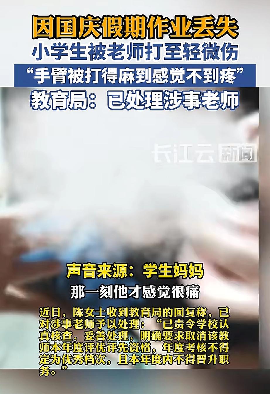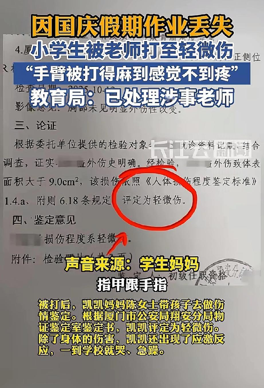 福建厦门,一名四年级男生在国庆假期丢失了两张卷纸,被学校老师用戒尺打得胳膊淤青。男孩还称老师对他有脚踢、推搡的举动。 妈妈看到男孩手臂上的青紫心疼不已,带他去医院做了鉴定,结果为轻微伤。 妈妈说:“孩子被打得都没了知觉,打到手和指甲时才感觉到痛,还出现了应激反应,一到学校就哭,就急躁,不愿意去学校。” 出现这种情况,个人建议家长给孩子转学。 教育局要求学校认真核查此事,并对该老师做出处理:取消其该年评优资格,年度考核不能定为优秀,且本年度不能晋升职务。 然而,男孩的妈妈对这一处理结果并不满意。 小学老师通常会把假期作业发到家长群里,孩子丢失两张卷子,家长难道没发现吗?还是平时家长根本就不关心孩子的作业情况呢? 记得很久以前,老师是可以使用戒尺的,七零后和八零后的人对此感触颇深。 那时的家长还会嘱咐老师:“孩子不听话,你就给我狠狠管教,没事的。” 那时的孩子没有现在这般脆弱,被老师管教后,没几天就忘了。如今都成为时代向前的一块基石。 如今的家长,只要觉得孩子受了委屈,或是像这样被老师用戒尺打了,都会心疼不已,有的会找老师理论,有的则会向教育局投诉。 从图片看,这位老师下手确实有点重,是当时太生气了吗?为了什么生气呢?仅仅是两张卷子的问题,还是学生态度问题呢? 有些家长,只期望孩子能平安健康,并不要求成绩。而每个老师都期待,自己的学生能成绩优秀,未来有光明的前途,这就出现了矛盾。 建议现在的老师要学会尊重学生,更要学会尊重家长,把认真负责的态度用在该用的地方。唯有家校彼此理解、双向奔赴,教育的步履方能走得沉稳又坦荡。 来源:长江云新闻
