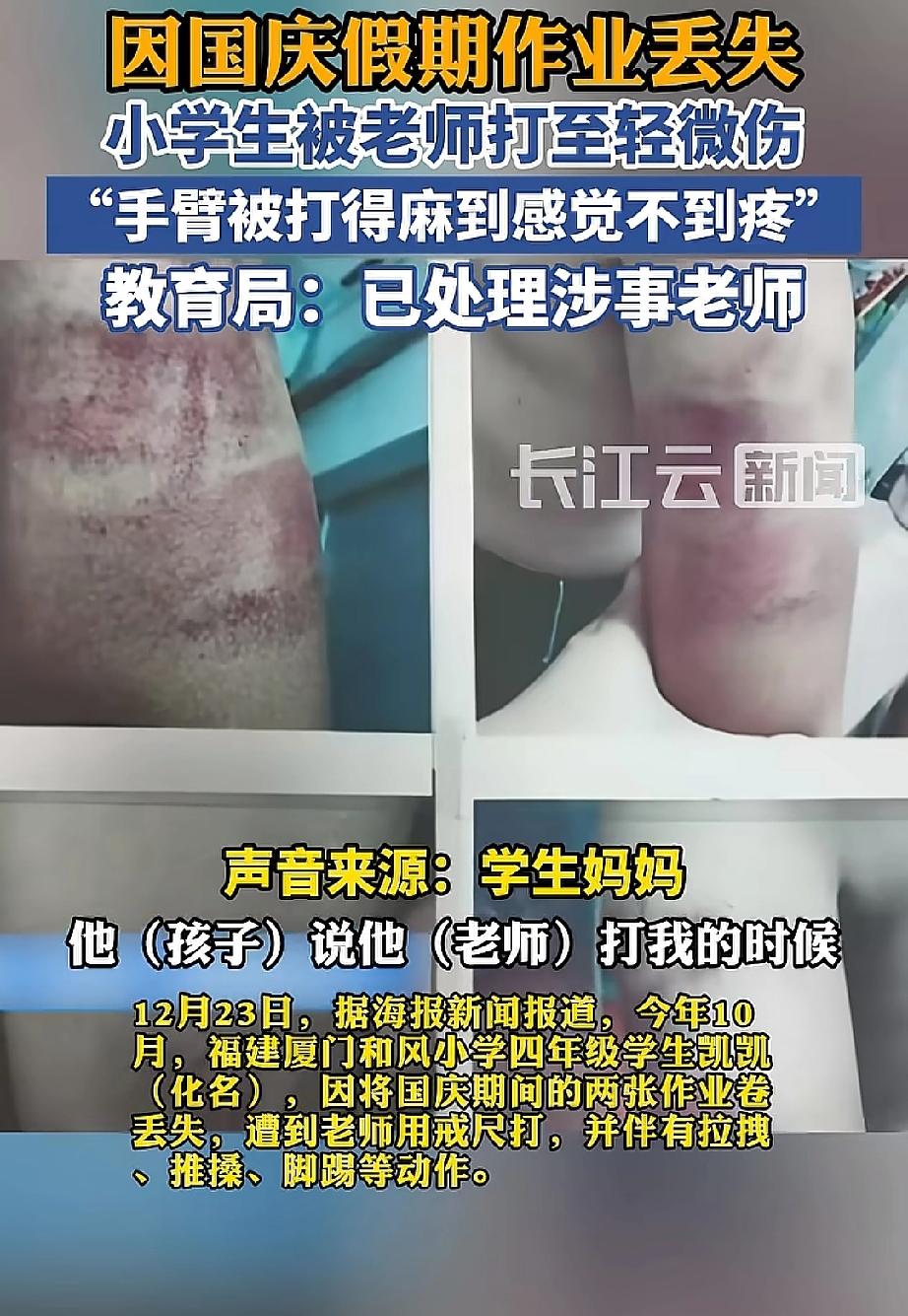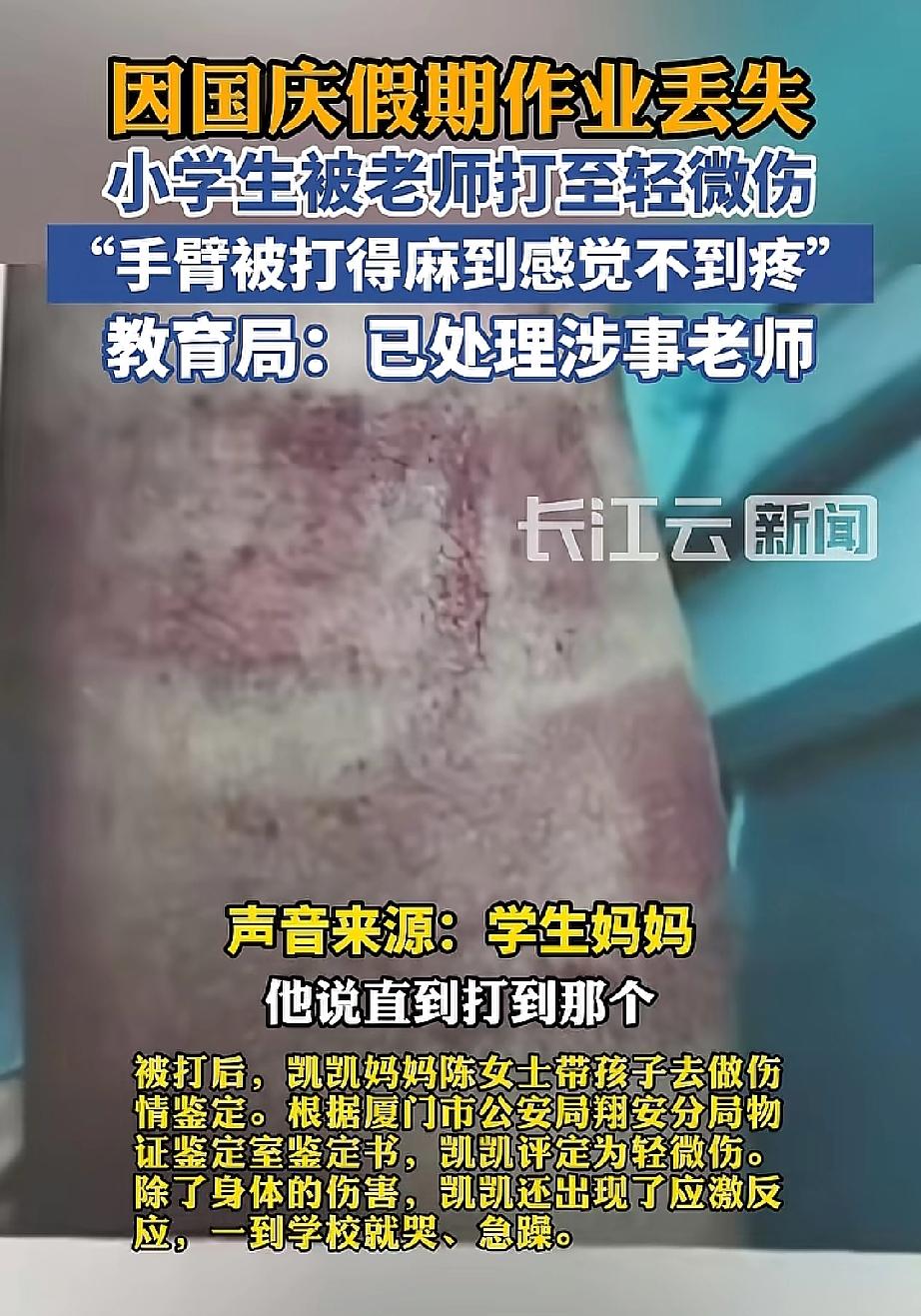 福建厦门,一名四年级男生在国庆假期丢失了两张卷纸,被学校老师用戒尺打得胳膊淤青。