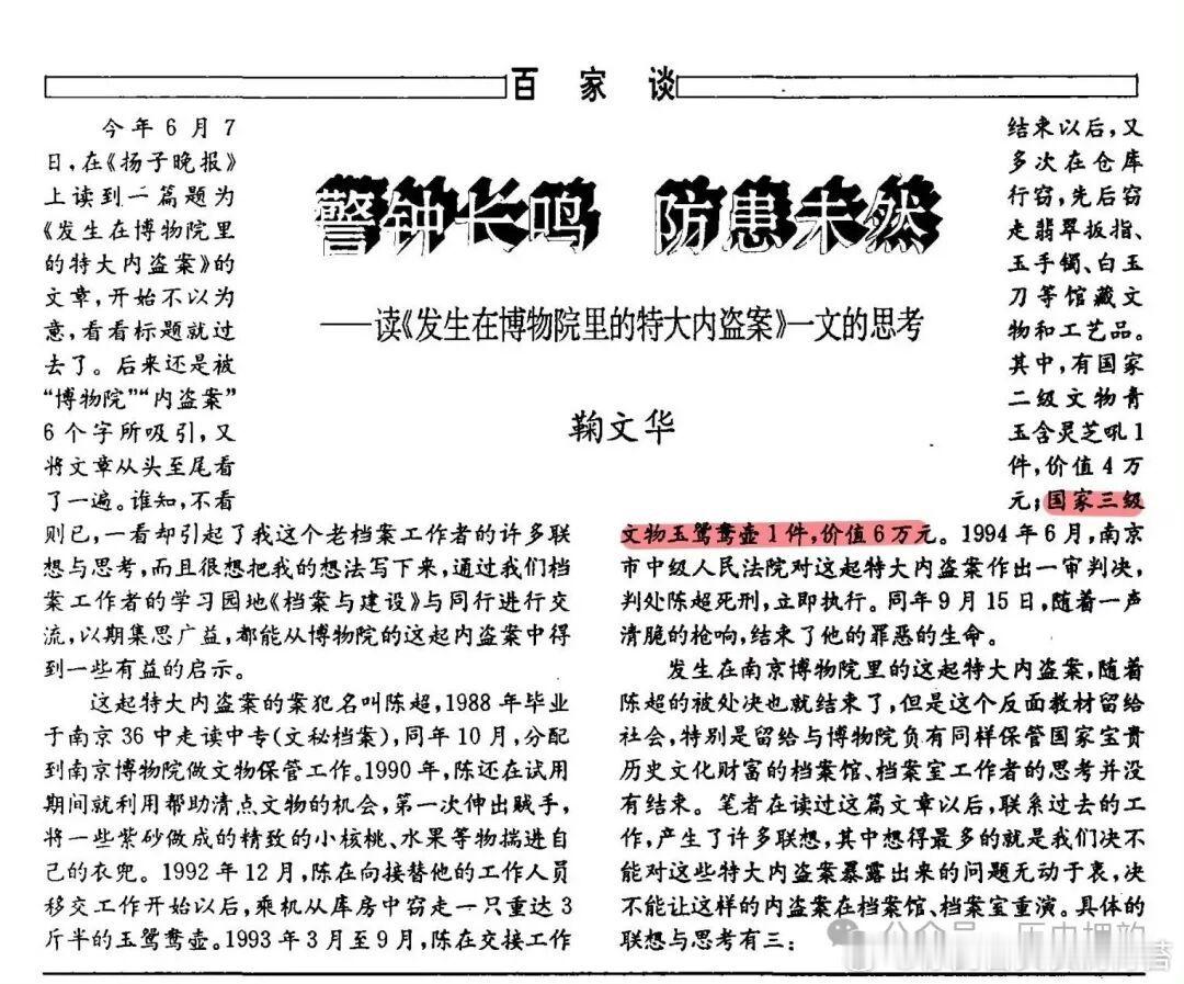 南京博物院南博前院长徐湖平曾送落马官员书画官方通报南京博物院事件 几张泛黄的报纸和如今引爆舆论的江南春图事件,拼出了一幅细思极恐的图景。1994年,南博保管员陈超被枪毙了,大快人心。但一个23岁的保管员,如何能独自完成19件文物的盗窃、销赃?他的上级在哪?监管在哪?入库清点制度在哪?枪毙一个陈超,就像割掉一棵杂草,但土壤里的毒素还在。二十年后,当《江南春》从库房“消失”时,南博的回应依然是:经鉴定为伪作,已按规定处置。还是那套“内部操作、无需解释”的逻辑。文物的“体外循环”到底有多顺畅?陈超的文物,从库房到黑市,估值缩水八成以上。《江南春》从“庞家捐赠”到“博物院赝品”再到“拍卖行珍品”,身价暴跌又暴涨上千倍。这中间的通道,三十年来是否一直通畅?那些被“鉴定”为不够格、被“调剂”处理的文物,最后都去了哪里?江苏省文物总店的销售清单上,还有多少“仿作”?南博前院长任职学校已被撤销国家文物局工作组赴南京6800元买走江南春图卷的顾客是谁