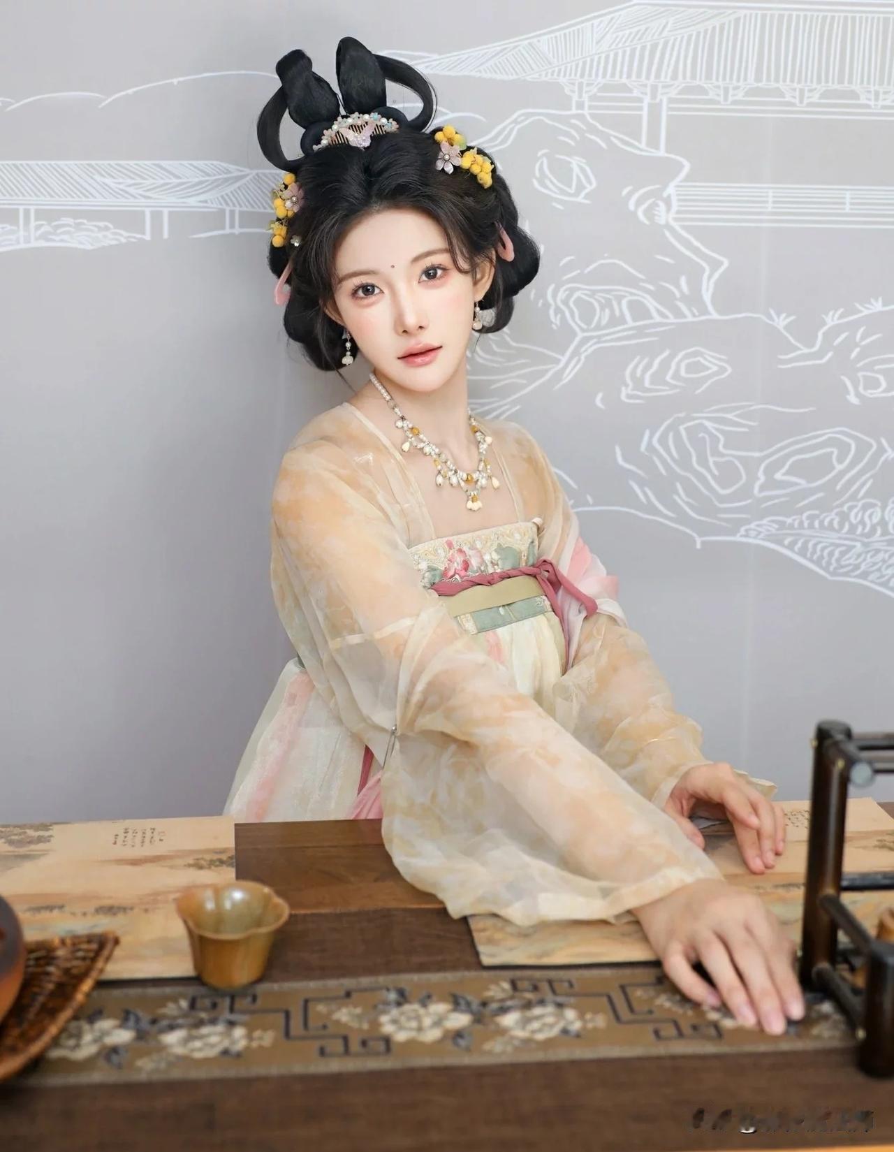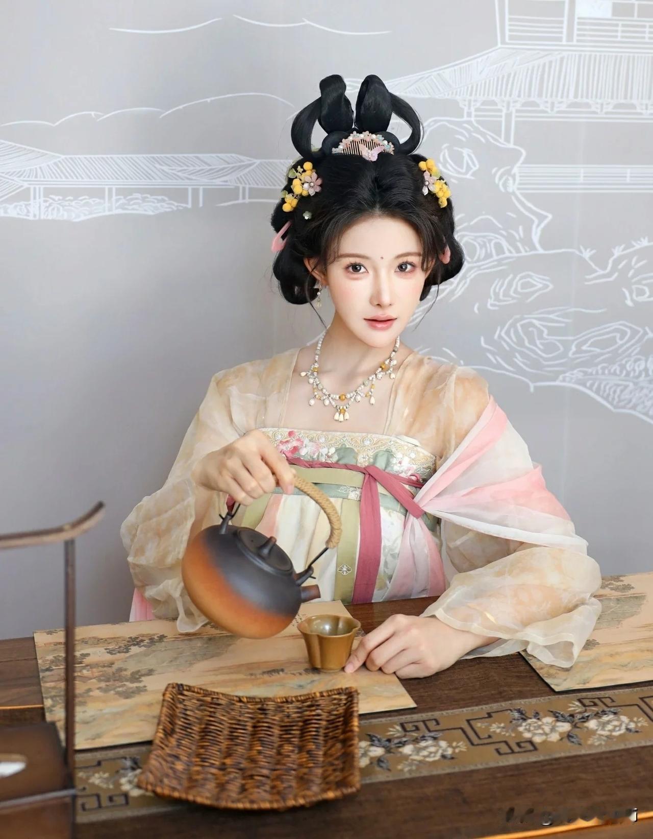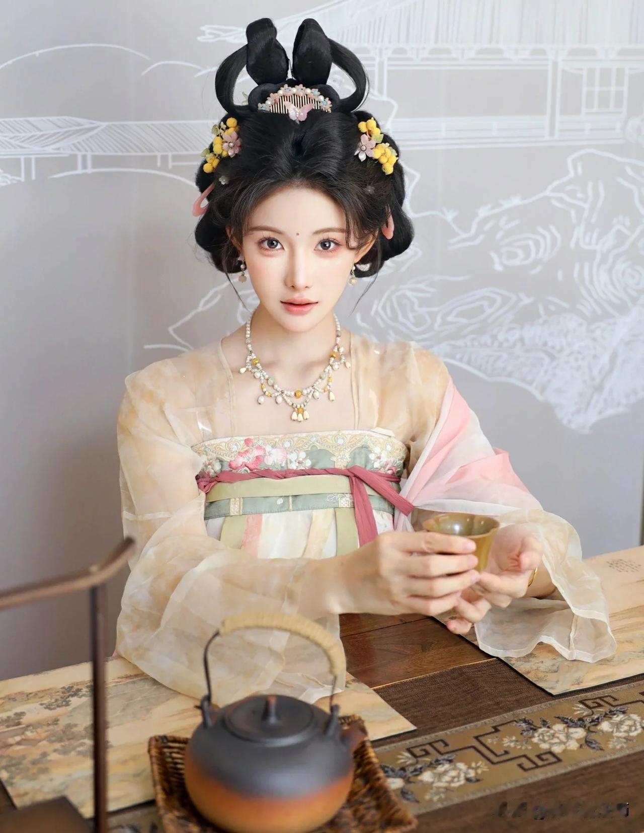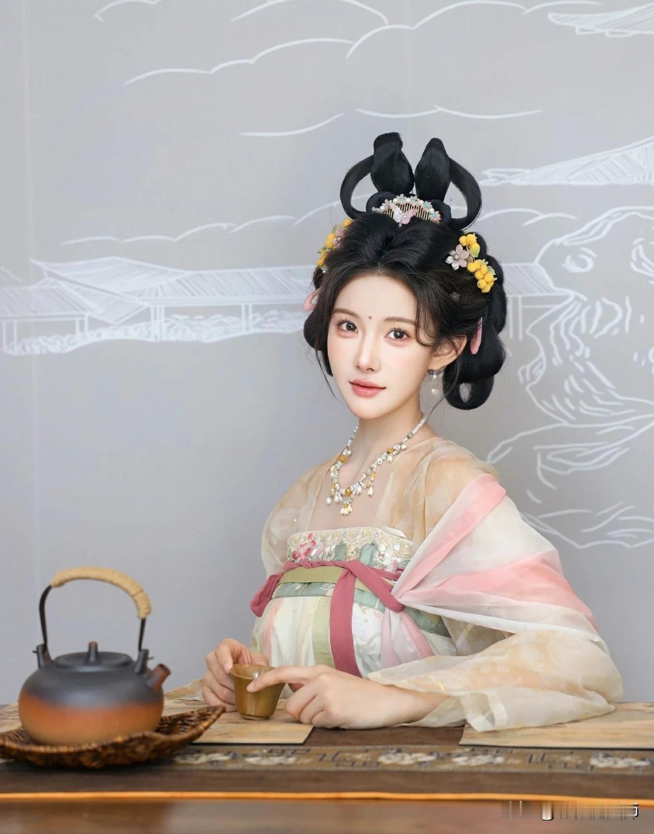 她端坐于茶案前,仿佛从唐代仕女图中缓步而来。双丫髻高耸如云,金钗玉饰点缀其间,几朵明黄色小花破题点睛,将古典发髻的庄重与俏丽平衡得恰到好处。淡粉色披帛自肩头垂落,似云霞轻绕,与浅绿抹胸、米白褶裙形成“粉墙黛瓦”的江南意象,每一层色彩都在光影中晕染出温婉的东方气韵。 茶壶与茶盏静列案上,她执壶倾茶时,广袖微垂,指尖动作轻柔如拈花;捧盏时双臂环抱,身姿挺拔却不失松弛。唐制襦裙的宽袖设计在动作中舒展如翼,既保留了传统服饰的仪式感,又暗合现代茶空间的雅致格调——原来古典美学的实用性,藏在每一寸不影响行动的裙摆长度里,藏在每一缕透气轻薄的纱料里,更藏在“形神兼备”的东方审美智慧中。 背景的山水线稿与现实中的茶器相映成趣,仿佛千年风雅在此刻交汇。她的神情从容,目光柔和却不失坚定,恰似职场女性在传统与现代间的自如切换:既能在会议室里以专业立足,也能在茶席间以风雅会友。这份来自盛唐的典雅,不仅是服饰的传承,更是东方女性从容气度的永恒注脚。唐代服装 唐髻雅韵 古典发髻图鉴 古装发髻照
