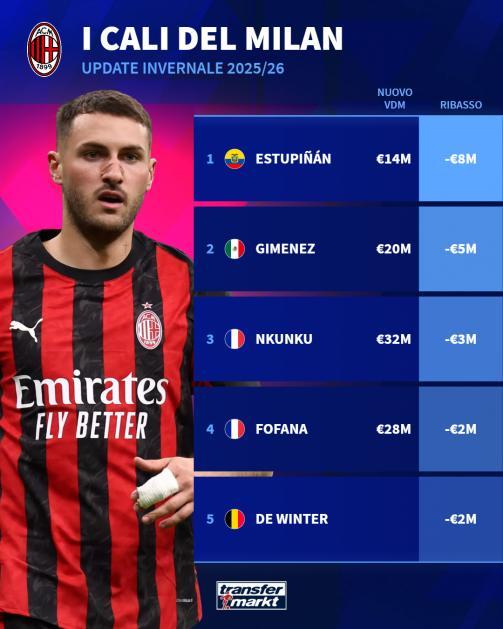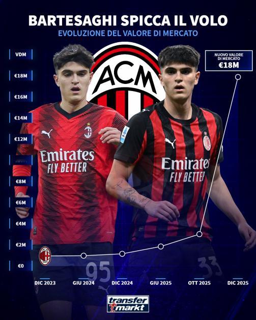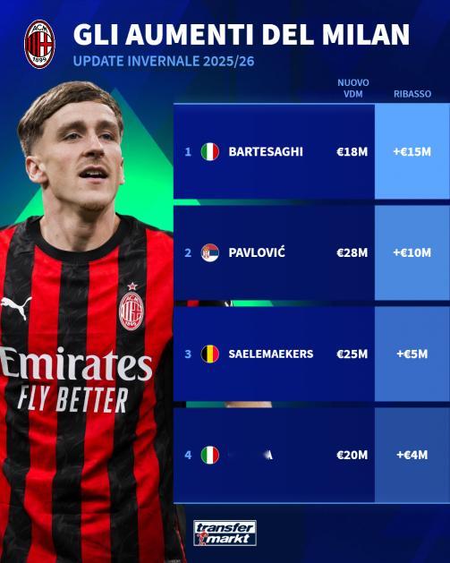 AC米兰 德转更新意甲身价,巴特萨吉狂涨1500万,至1800万。帕夫洛维奇上涨1000万。埃斯图皮尼安降价800万。忠生米兰sempremilan