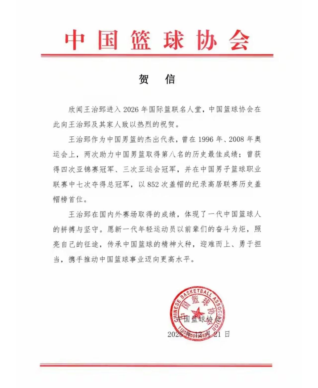 “恭喜王治郅! 国际篮联公布了2026年FIBA名人堂入选名单, 王治郅成功入选, 成为第五位入选FIBA名人堂的中国篮球运动员。 他在篮球场上的精彩表现, 曾给我们带来无数激动时刻, 他的职业生涯堪称传奇, 这是对他篮球成就的高度认可, 也是中国篮球的骄傲!”篮球史排名 篮球历史排名 王治郅 2025名人堂 体坛名人堂