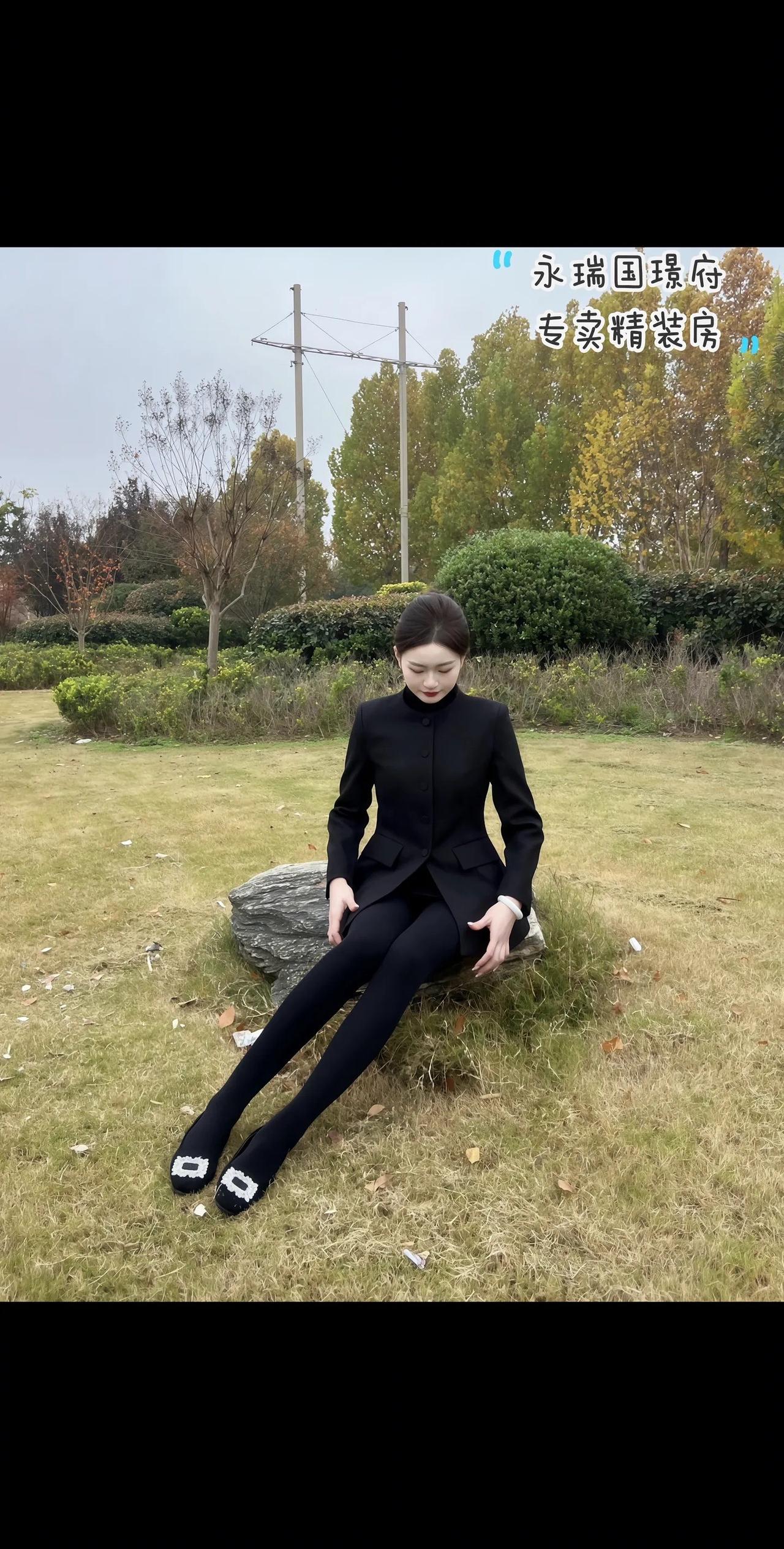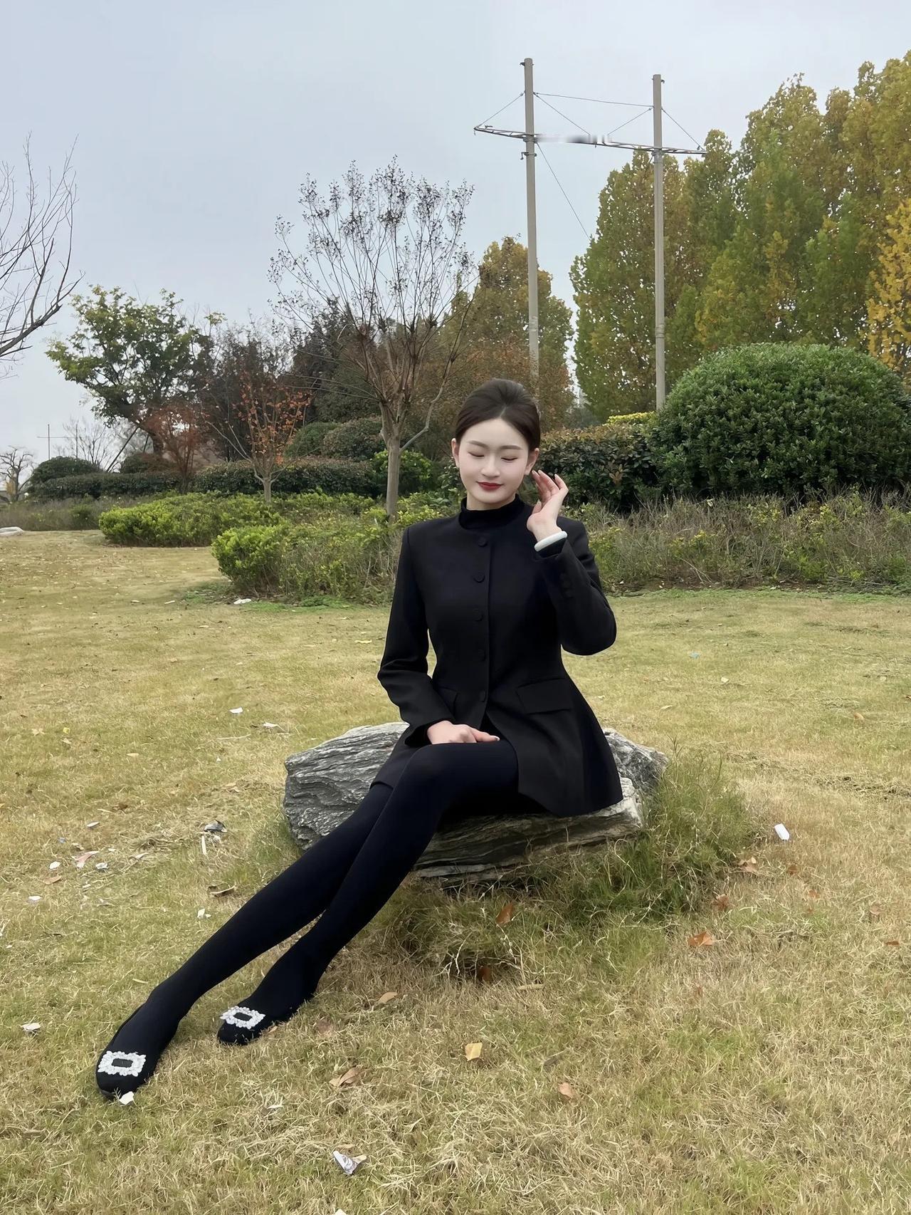 优雅黑裙穿搭,冬日公园的时尚气息