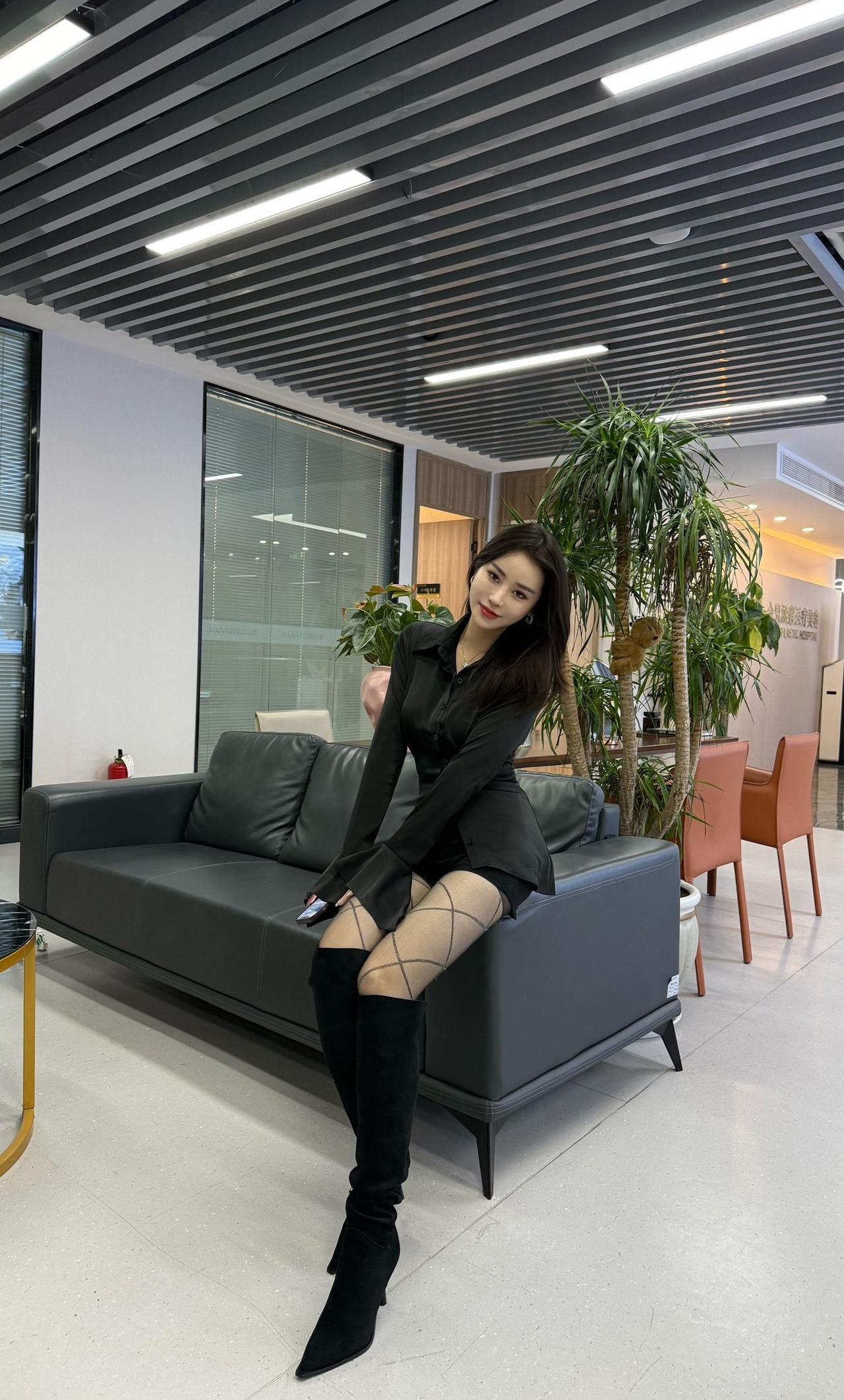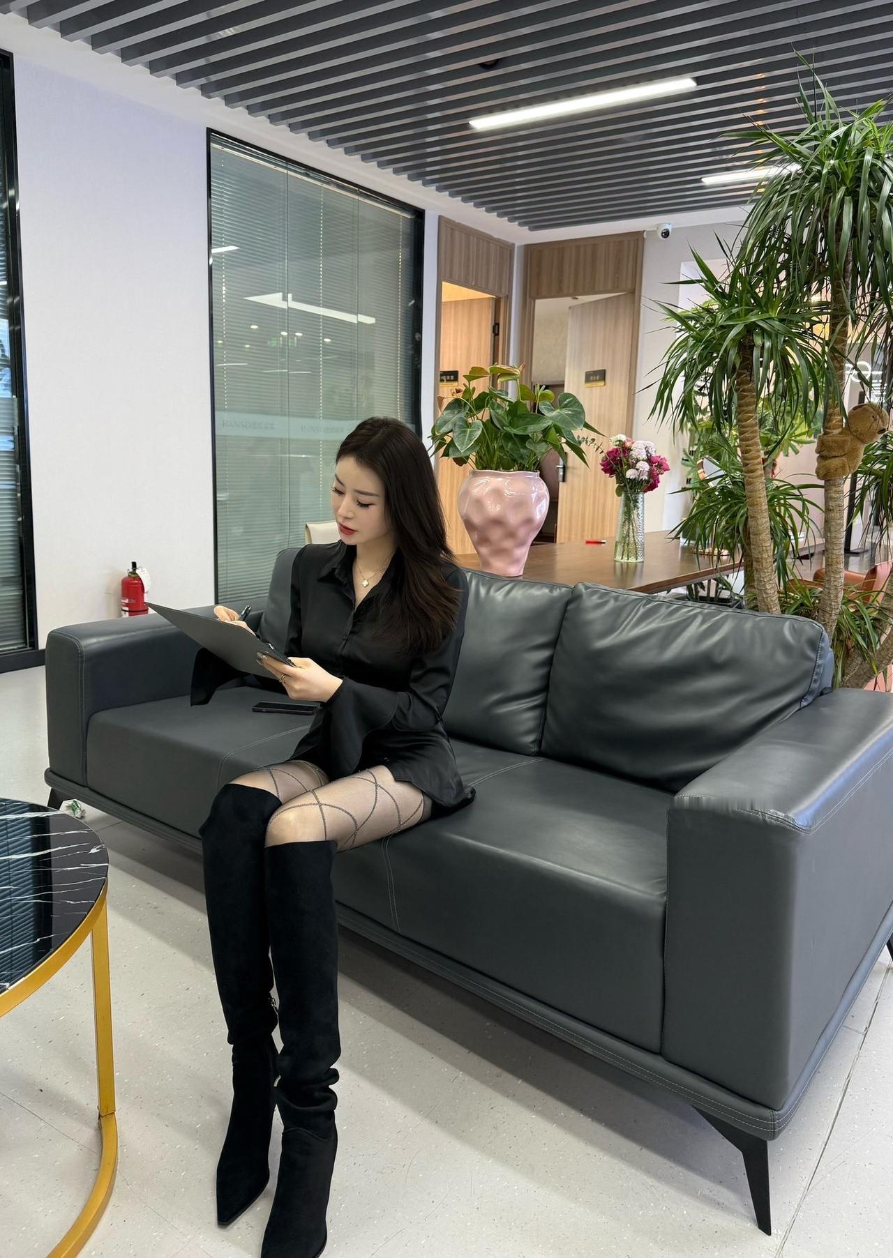 优雅办公空间,时尚穿搭,黑丝与皮靴的完美搭配
