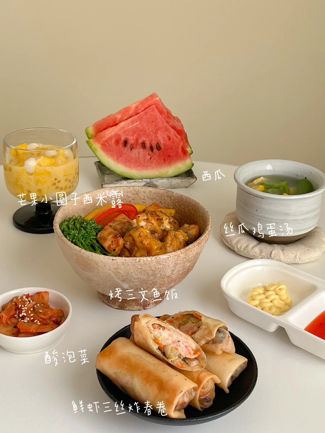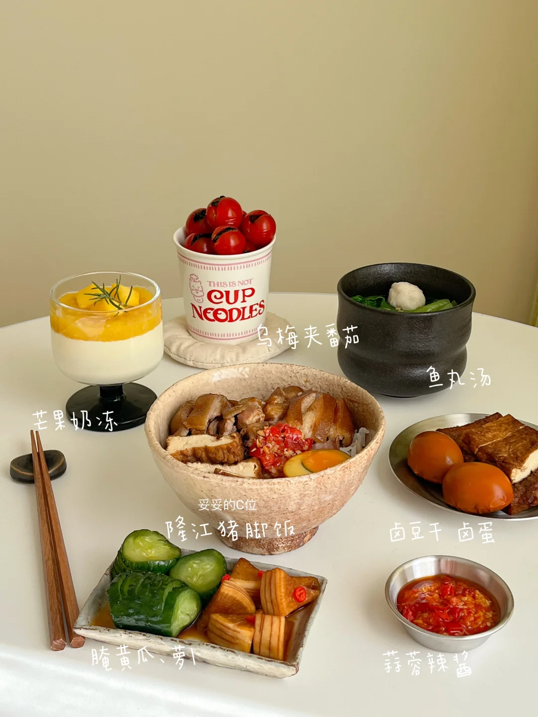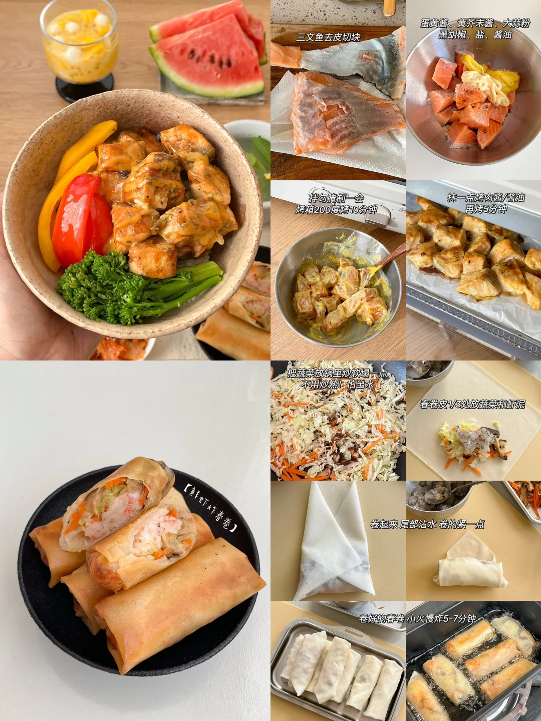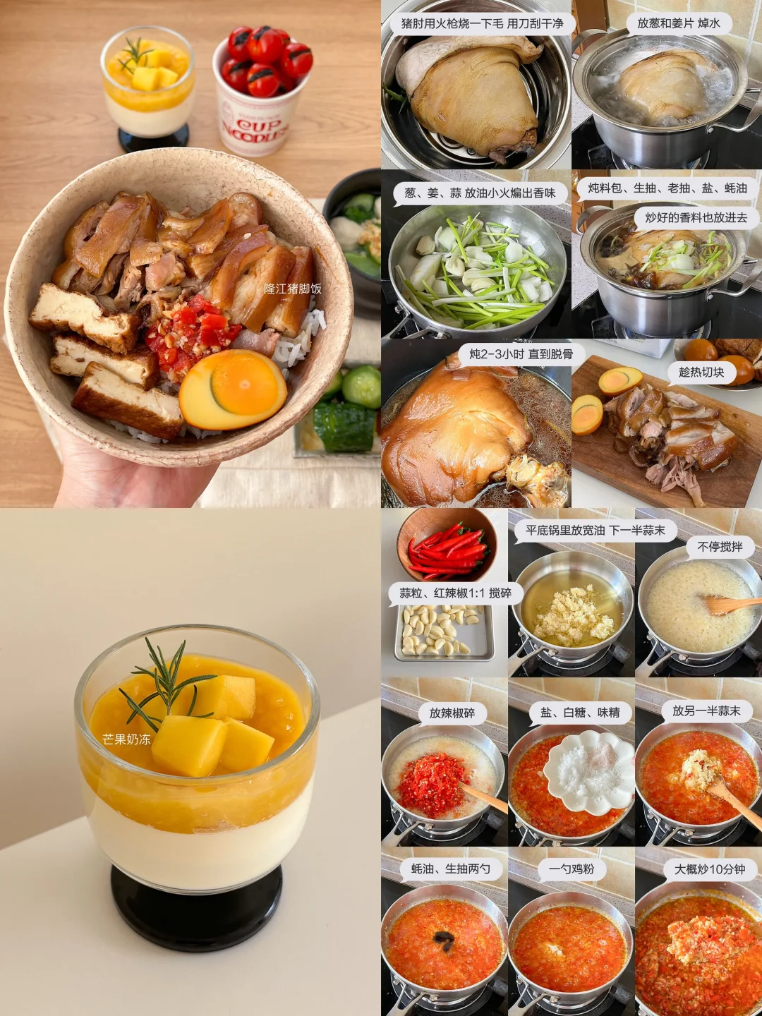 “原来在休息的日子 每天都有好好吃饭~” 隆江猪脚饭🍱 乌梅夹番茄🍅 鱼丸汤🍲 卤豆干卤蛋🥚 芒果奶冻🍨 番茄土豆排骨汤🍖 清炒奶白菜🥬 黄油煎杏鲍菇🧈 红薯饭🍚 草莓布丁🍮 烤三文鱼饭🧄 鲜虾三丝炸春卷🍤 芒果小圆子西米露🍧 西瓜鸡蛋汤🍳 花菇葱油鸡翅焖饭🍗 炸蒜蓉凉拌菠菜🥗 蓝莓山药泥🫐 番茄蔬菜汤🌽