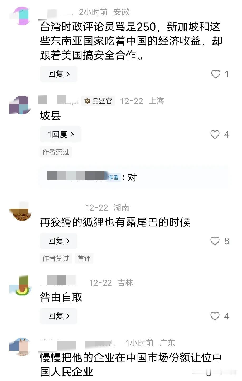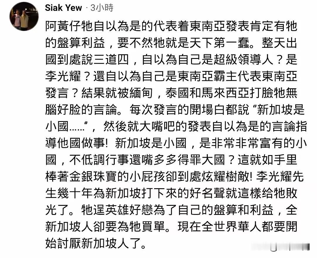新加坡政客批黄循财一句话把新加坡几十年的打下的好名声都败光了,称黄循财每次开口第一句话都是新加坡是一个小国,但是下一句就开始自以为是指导大国怎么做事,认识到自己是小国,就要低调行事,不要嘴多去得罪大国,这次黄循财的的言论,不仅仅是得罪大国一个问题,而是整个华人圈都要开始讨厌新加坡了,因为只要是正常的华人,谁不对日本有历史的仇恨,很多华人还是因为那个时候日本的侵略,祖辈才跑出去的,而且东南亚的华人也被日本迫害过,所以正常的华人都对日本有这种深刻的历史记忆!