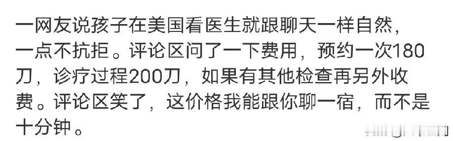 土殖夸美国儿童医生从孩子出生就会跟随,所以熟悉每个孩子的情况,看医生就像聊天一样自然!然后网友一问,预约一次180美元,诊疗费200美元,这还是“话疗”,其他项目另算,评论区网友直呼这个价钱,我能和你唠一宿,要是在国内这群土殖连十块钱挂号费都会觉得贵,然后说医院把病人当做生意来做,然后各种抱怨! 别的不说,甜甜圈的急诊话疗5670美元,让它对美国破口大骂,从此信仰倒塌,还有陈旺去看牙,也是“话疗”了15分钟,收到2327.44美元的账单,气得陈旺宣布要自己建立“移民国”了,准备逃离银河系去建立自己的移民国!还有很多在美国工作的华人,有病都攒起来,然后放假就飞回国内看病,因为效率高,还便宜,不会小病拖成大病!所以这么多案例摆着,就不要再吹美国的医疗了!