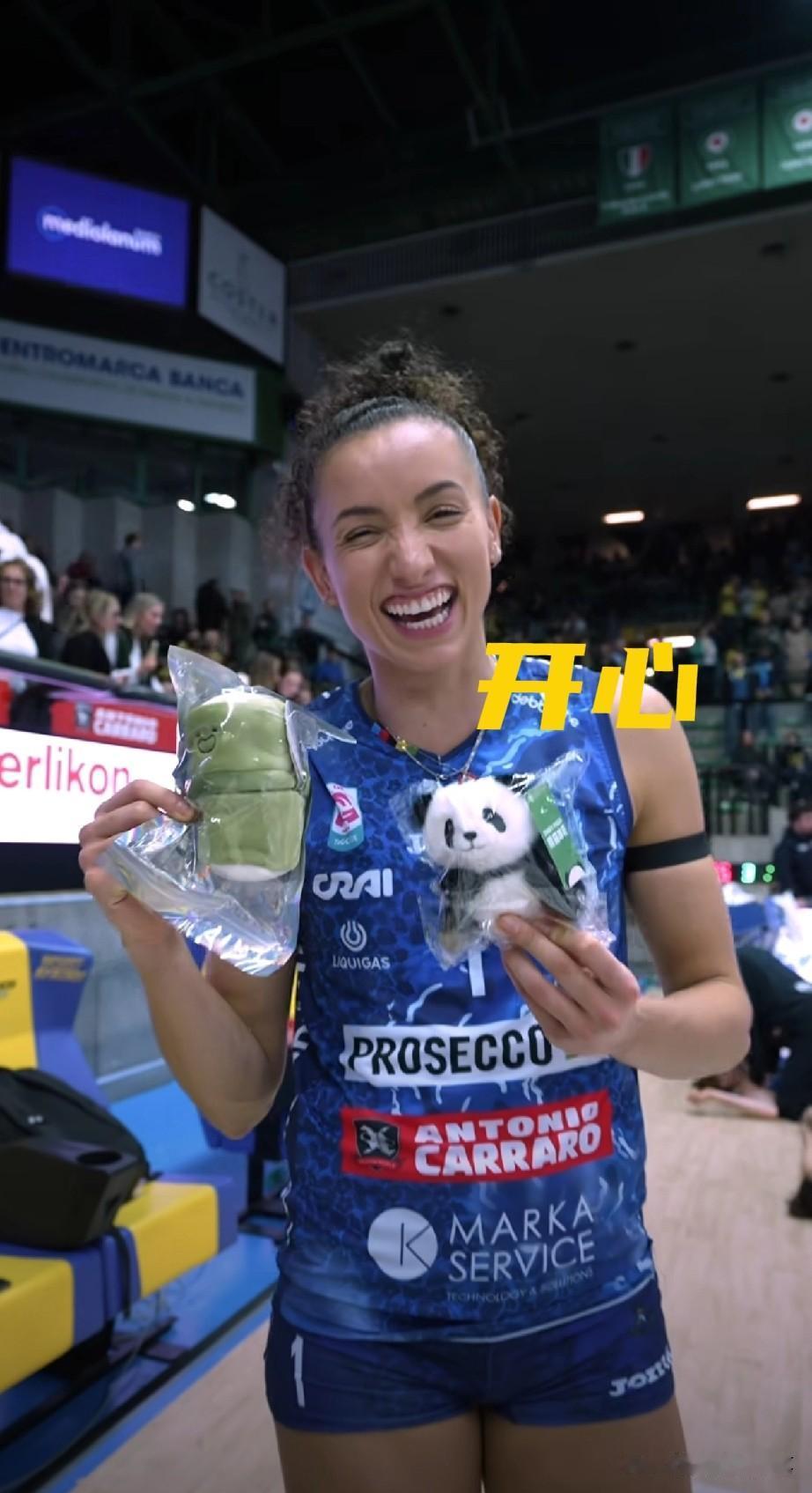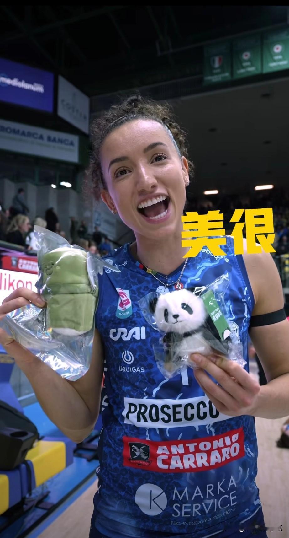 庄宇珊,社牛一枚啊[呲牙] 瞧,加比笑得呲牙咧嘴,一手拿熊猫,一手拿竹筒,开心得要跳起来了[呲牙]。收到庄宇珊的礼物,别提,她比赢球都开心啊。科内利亚诺女排队友要羡慕死加比了吧。庄宇珊也很开心,在意甲同偶像合影,是一件多么令人幸福的事。 别说,庄宇珊还真会来事。祝阿庄越来越好,早日成为国际赛场像加比一样闪亮的星。土楼姑娘庄宇珊 庄羽珊意甲首秀 排球运动员加比