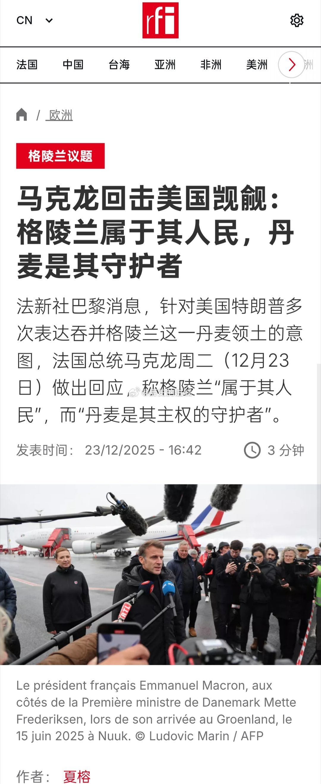 针对美国特朗普多次表达吞并格陵兰这一丹麦领土的意图,法国总统马克龙周二(12月23日)做出回应,称格陵兰“属于其人民”,而“丹麦是其主权的守护者”。