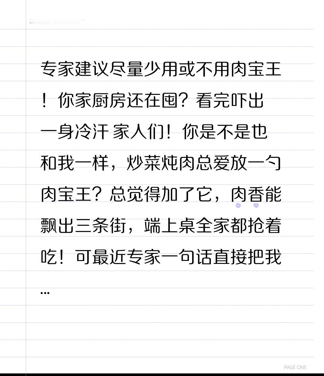 专家建议尽量少用或不用肉宝王!你家厨房还在囤?看完吓出一身冷汗 家人们!你是不是也和我一样,炒菜炖肉总爱放一勺肉宝王?总觉得加了它,肉香能飘出三条街,端上桌全家都抢着吃!可最近专家一句话直接把我整懵了——建议大家尽量少用,最好不用肉宝王! 这到底是为啥?咱们天天吃的“增香神器”,难道藏着什么猫腻? 说实话,一开始我根本不信!肉宝王多好用啊,不管是寡淡的鸡胸肉,还是腥味重的牛羊肉,放一点立马香到骨子里,做饭小白都能秒变大厨。直到我扒开了肉宝王的配料表,才发现事情没那么简单! 你仔细看,配料表里排在前几位的,往往是香精、呈味核苷酸二钠、麦芽酚这些化学添加剂。专家说了,这些成分短期吃可能没啥感觉,但长期过量摄入,会加重肾脏的代谢负担。尤其是家里的老人和孩子,脾胃功能本来就弱,经常吃这种“科技狠活”,真的太伤身体了! 更关键的是,很多人以为肉宝王是“天然提取”,其实市面上不少廉价产品,根本不是什么肉精华,全靠化学物质勾兑。咱们花着钱,给家人吃的却是一堆添加剂,想想都后怕! 当然了,也不是说所有增香调料都不能碰。像咱们传统用的八角、桂皮、香叶、冰糖,这些天然香料,炖肉时放一点,香味醇厚又健康,吃着才放心。 家人们,咱们忙活一辈子,不就是为了家人吃得健康、过得舒心吗?以前总想着偷懒,靠科技调料省时间,现在才明白,真正的美味,从来都不是靠添加剂堆出来的。 那些藏在厨房角落里的肉宝王,是不是该清理清理了?与其依赖“科技狠活”,不如多花点心思,用天然食材熬出一锅好汤,用传统香料炖出一碗肉香。 健康不是小事,从一勺调料开始改变!同意的家人们,点赞转发,提醒身边的亲戚朋友,别再被“增香神器”忽悠了!咱们一起,把厨房的健康关把牢!