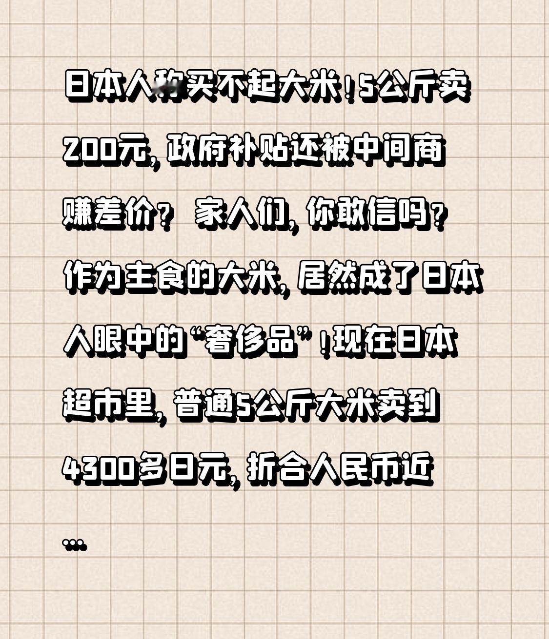 日本人称买不起大米!5公斤卖200元,政府补贴还被中间商赚差价? 家人们,你敢信吗?作为主食的大米,居然成了日本人眼中的“奢侈品”!现在日本超市里,普通5公斤大米卖到4300多日元,折合人民币近200元,知名的“越光米”更是突破5000日元,同比涨价超40%!不少日本民众吐槽:“工作一小时赚的工资,刚够买1公斤大米”,甚至有人被迫改吃面条,这场“大米危机”到底是怎么回事? 一开始大家都以为,米价暴涨只是天灾——极端高温加病虫害导致水稻减产,再加上入境游客增多,需求猛增打破了供需平衡。可越挖细节越发现,这场危机根本是“天灾+人祸”的双重叠加! 关键转折点来了:日本长期实行“减产政策”,人为控制水稻种植面积,本来供需就很紧张,偏偏部分私企和农户还趁机囤积大米,让分销环节彻底失灵,超市频频断货。更让人无语的是政府的操作:前首相石破茂时期,靠投放储备米让米价降到过3000日元左右,可新内阁上台后,直接取消了这个政策,反而推出“大米券”补贴。 可这大米券纯属“坑爹”操作!面值500日元的券,实际只能换440日元的大米,剩下60日元全花在印刷、流通上了。地方政府算过账,5亿补贴款要被扣除1亿手续费,连大阪府都直接拒绝发放,宁愿把钱用在降低污水处理费上。民意调查显示,53%的人反对这个政策,赞成的只有28%,大家吐槽这是“羊毛出在羊身上,还被中间商赚差价”。 更核心的问题是,日本对进口大米征收778%的高额关税,国际低价米根本进不来,只能靠本土供应。而农协又垄断市场,靠控制种植面积维持高价格,普通民众只能被迫买单。现在日本网友还发明了“古米奋战”的新词,靠吃存放一年的陈米过日子,想想都让人唏嘘。 一碗白米饭,本该是最基础的民生保障,可在日本却成了普通人难以负担的开销。这场大米危机,暴露的不只是天灾带来的粮食短缺,更是政策失衡、市场垄断下的民生困境。 其实不管哪个国家,主食安全都是底线。我们之所以能顿顿吃上平价大米,离不开稳定的粮食生产和合理的调控政策。珍惜眼前的烟火气,感恩每一粒粮食的来之不易,才是最实在的幸福。 希望日本能早日解决大米危机,也愿每个国家的民众都不用为“吃饱饭”发愁。同意的家人们,点赞转发,说说你觉得该怎么破解这种粮食涨价困局?