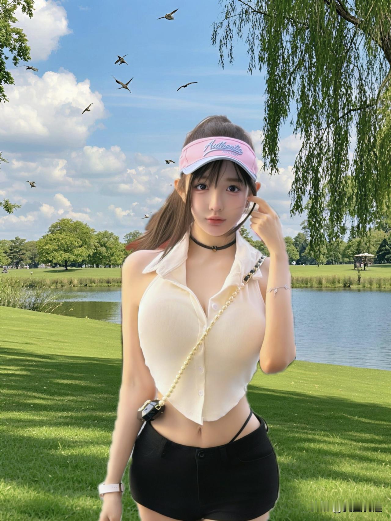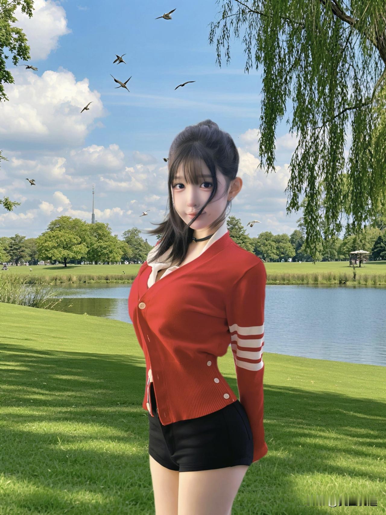阳光明媚的湖畔,时尚穿搭的少女,享受美好时光。🌞👗💃