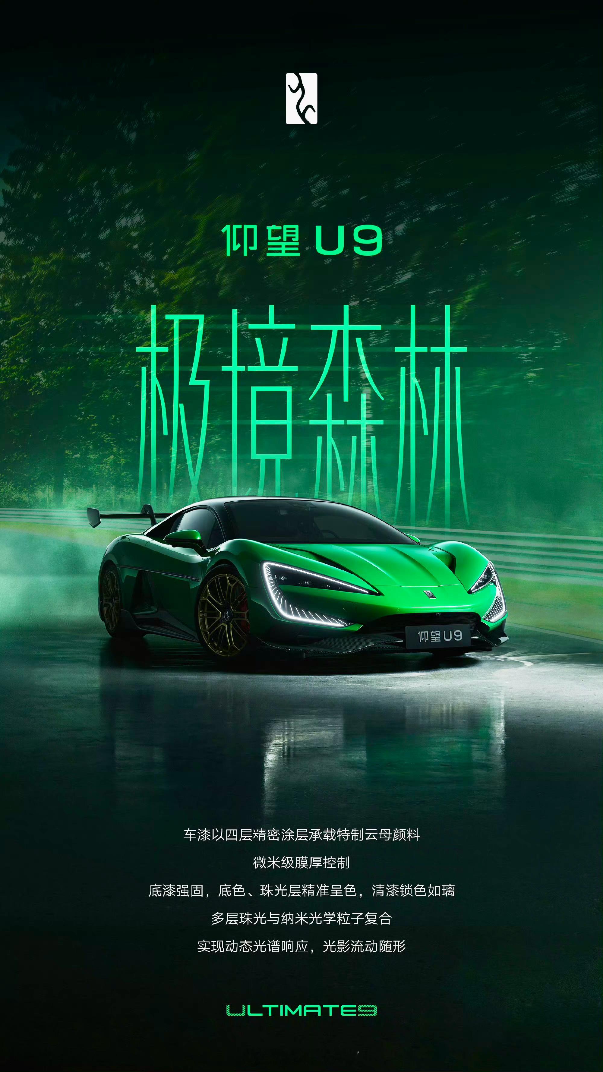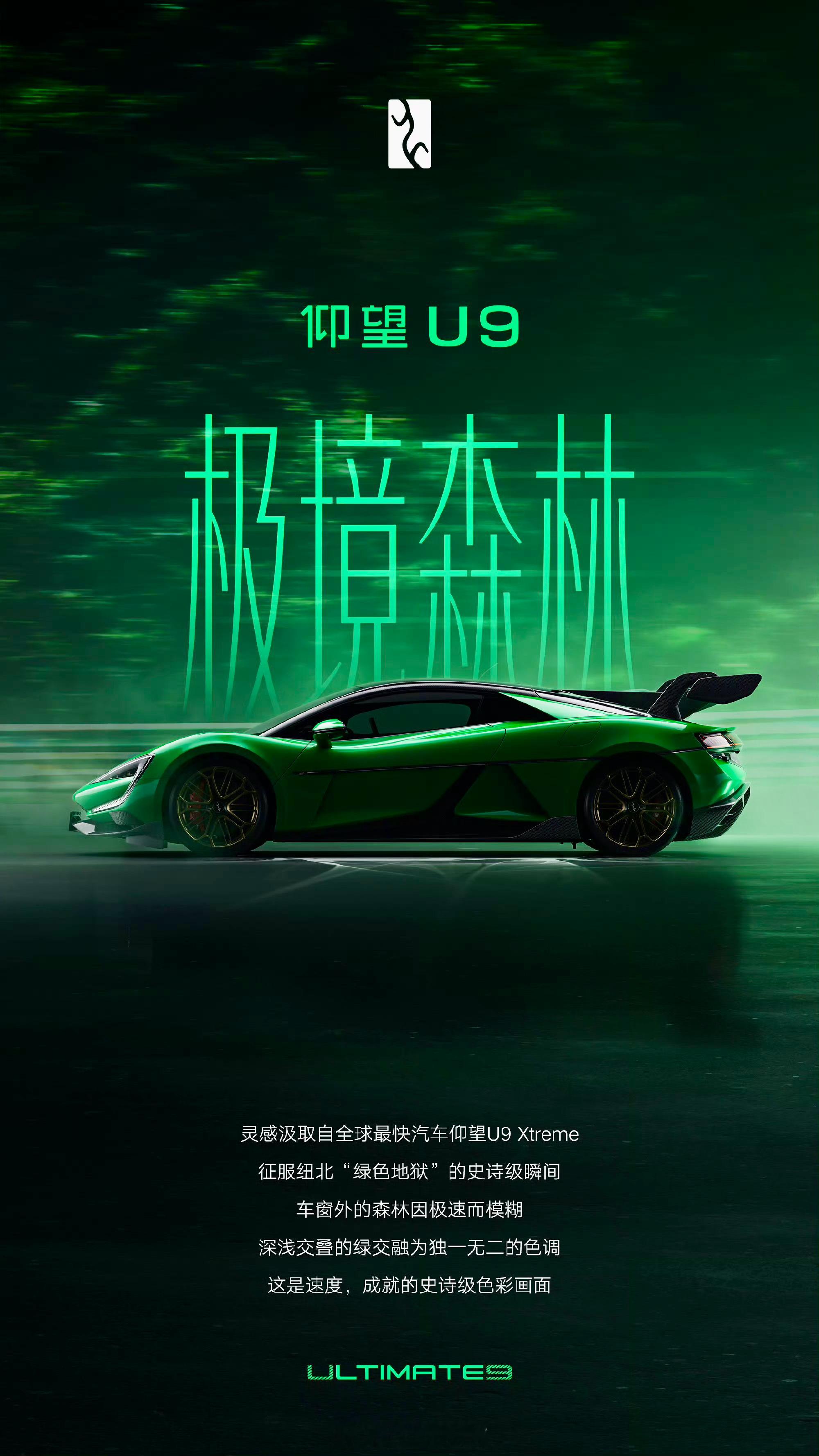 仰望U9今天出了个新颜色——「极境森林」。 为庆祝U9 Xtreme在纽北刷新电动车圈速,设计师把高速飞驰时窗外模糊的森林绿光,做成了车漆。 四层喷涂,静看是深林,一动就泛光。 说白了仰望U9,穿的是赛道同款皮肤。