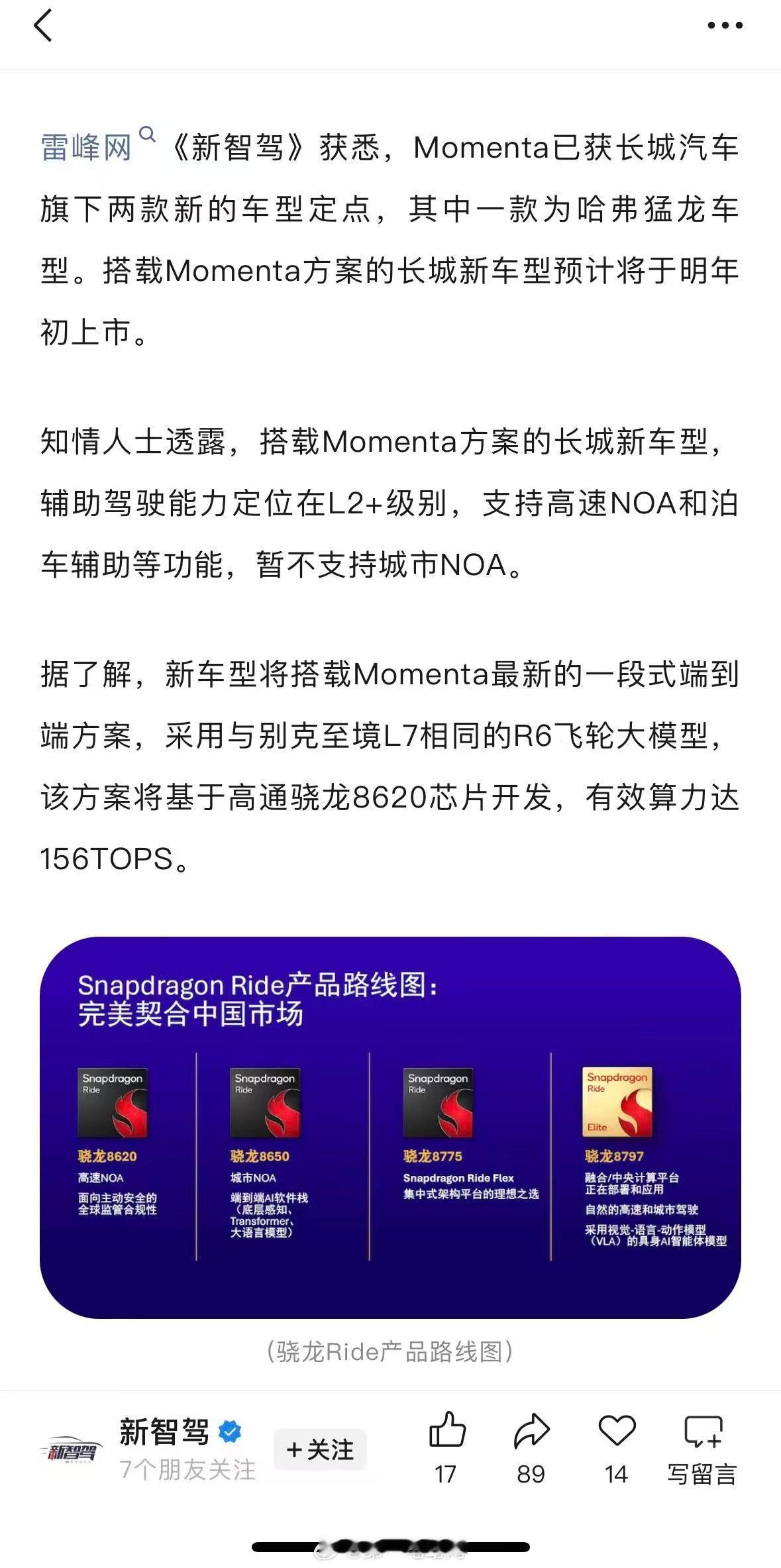 雷峰网《新智驾》报道,Momenta公司已获得长城汽车旗下两款新车型的定点合作,其中包括哈弗猛龙车型。预计搭载Momenta方案的长城新车型将于明年年初上市。这些新车型的辅助驾驶能力将定位在L2+级别,支持高速NOA和泊车辅助等功能,但目前暂不支持城市NOA。新车型有望搭载Momenta最新的一段式端到端方案,该方案采用与别克至境L7相同的R6飞轮大模型,并基于高通骁龙8620芯片开发,有效算力达到156TOPS。如果不支持城市NOA的话,就不能参加我们的第二届中国智驾大赛长城汽车Momenta