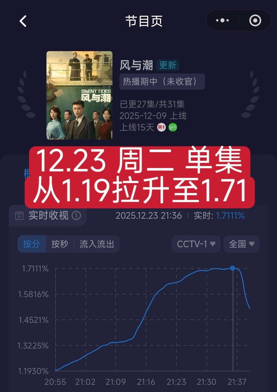 看看任嘉伦风与潮收视率,今晚9点后的拉升幅度不仅超过了昨天,甚至超过了上周五!留