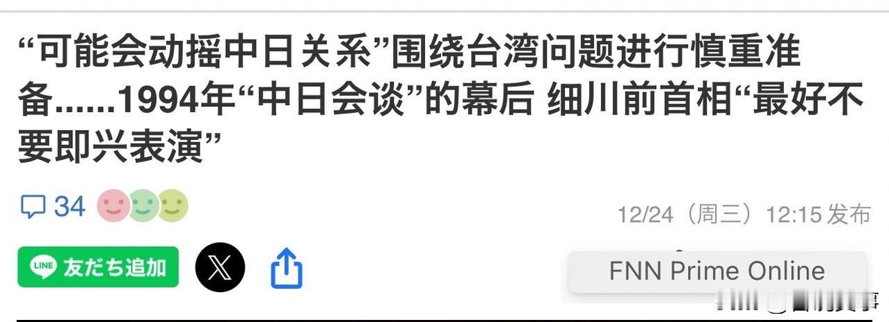非常不满!日本前首相表态! 针对高市早苗的涉台言论,日本前首相细川护熙接受采访时表示,“成为首相的话,可能会觉得把自己的想法推到过去也可以,但我觉得那有点不一样。外交有很多积累。和对方的敏感问题,最好不要即兴表演。” 细川护熙进一步“日本殖民侵略给亚洲各国带来沉重伤害,我的想法从未改变。当前政府不应在台湾问题上冲动表态,应回到中日邦交正常化,不再动干戈的原点。” 值得一提的是,细川护熙在1993年以首相的身份明确承认日本对外发动的是侵略战争,并发表道歉讲话。中日关系紧张时,努力推动双方理解与合作,强调中日是“难分难舍的紧密互惠关系”。