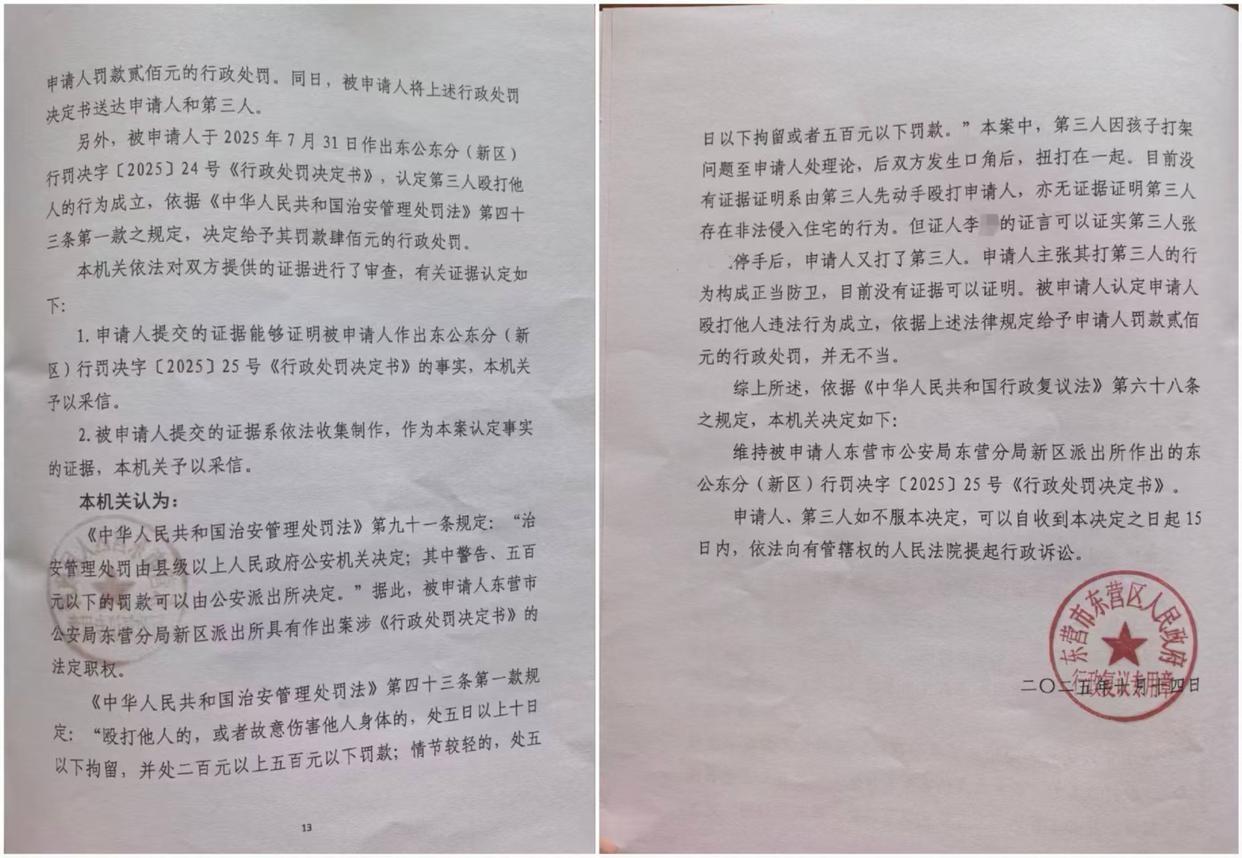山东东营,一18岁女孩家突然遭到陌生女子强闯,双方发生了口角并延伸到肢体冲突。邻居见状分开二人后,女孩报了警。可警方却认定二人属于互殴,对陌生女子罚款400元,对女孩罚款200元。事后女孩的母亲不服,认为对方是非法侵入住宅,自己的女儿是正当防卫,但警方表示认定互殴没错。(来源:西安晚报) 今年2月26日晚上7时许,18岁的女孩小刘独自在家,妈妈郭女士正在外地出差。 这时有人突然敲门,小刘不敢直接开门,于是通过猫眼看了看外面,发现是两名陌生女子和一个与弟弟差不多大的孩子。 小刘开门后询问对方要找谁,其中一名女子张某气势汹汹地说自己孩子被小刘的弟弟打了,一边走进屋内,一边要求做家长的出来道个歉。 小刘当时就回复了对方,让对方去找学校老师去。 张某见小刘这种不负责任的态度,气得大骂了起来。小刘不甘示弱,也和张某对骂了起来。 随后张某与小刘打在了一起,互相撕扯着头发。邻居李某听到动静后,立即过来将二人分开。 之后,小刘报了警,并对伤情做了鉴定,结果显示是脑外伤神经症性反应,头皮血肿,右耳听力下降,右耳耳鸣,伤情达到了轻微伤的程度。 《治安管理处罚法》第43条规定,殴打他人的,或者故意伤害他人身体的,处5~10日拘留,并处200~500元罚款;情节较轻的,处5日以下拘留或者500元以下罚款。 按理说张某将小刘打成了轻微伤,这至少得行政拘留,可警方认为张某和小刘是互殴行为,所以仅对张某罚款400元,对小刘罚款200元。 郭女士对于警方的认定表示不服,她认为小刘的行为属于正当防卫,于是申请了行政复议。 郭女士表示,警方在询问小刘时,小刘明确表示张某是强闯进来的,且虽然与张某有互骂行为,但并未先动手。 可警方却采信了张某等多人的陈述,认定小刘先动手拉住张某的头发将其拽倒在地。 此外,小刘称被邻居李某分开后,自己并没有再动手打人,可警方从李某这个证人那里获取的信息是,在李某分开二人后,小刘又动手打了张某两下。 郭女士表示,她并不认识这个邻居李某。 2025年8月份,郭女士申请了行政复议,认为张某的行为属于非法侵入住宅,小刘是正当防卫。 复议机关审查后认为: 第一,警方在调查过程中,采信了张某等多人的陈述,认定是小刘先抓住张某的头发将其按倒在地,所以得出了无法证实张某先动手打人的情况。 第二,郭女士申请认定张某的行为属于非法侵入住宅,但现有证据无法证实是张某等人强行破门而入。在证人李某发现张某和小刘打架时,二人已经在小刘家中了。 第三,郭女士申请认定小刘的行为属于正当防卫,但证人李某证实在拉开张某和小刘后,小刘又打了张某两下,所以小刘的行为不符合正当防卫。 综上,复议机关认为警方认定互殴没有问题,故驳回了郭女士的申请。 《治安管理处罚法》第93条规定,公安机关查处治安案件,对没有本人陈述,但其他证据能够证明案件事实的,可以作出治安管理处罚决定。但是,只有本人陈述,没有其他证据证明的,不能作出治安管理处罚决定。 本案中,由于小刘家中没有监控摄像头,所以无法知道当时具体发生了什么。 目前能掌握的证据是: 第一,小刘的口供。小刘说没有先动手殴打张某,且张某是强闯进屋的,被李某分开后也没有动手打张某。 第二,张某等人的口供。张某等人说是小刘先动手拉住张某头发将其拽倒在地,随后二人才发生了肢体冲突。 由此可见,小刘与张某的都是口供,并没有确凿证据证明二人是谁先动的手,也没有确凿证据证明张某是强闯进屋,还是说小刘开门让对方进来的。 因此,这些单纯的口供证据,按照规定是不能轻易采信的。毕竟谁也不知道双方谁说的是真,谁说的是假。在这种情况下,谁都有可能向着对自己有利的方向进行陈述。 不过,在邻居李某的证词中,表示在将张某和小刘拉开后,小刘又打了张某两下。 这一点其实非常关键,也是警方认定小刘的行为不构成正当防卫的主要原因。 根据《关于依法适用正当防卫制度的指导意见》的规定,因琐事发生争执,双方均不能保持克制而引发打斗,对于有过错的一方先动手且手段明显过激,或者一方先动手,在对方努力避免冲突的情况下仍继续侵害的,还击一方的行为一般应当认定为防卫行为。 也就是说,小刘在被分开后还打了张某两下,就足以认定其行为属于事后报复行为,在加上无法证明是谁先动的手,所以无法认定小刘的行为属于正当防卫。 如果郭女士要推翻警方的这项认定,必须排除李某这个证人的身份。比如证明李某与张某等人是一伙的。 如果郭女士对复议后的结果还是不服的,可以向法院提起诉讼,但在证据缺失严重的情况下,这个案子想翻的难度还是很大的。 对此,您怎么看?欢迎留言交流。
