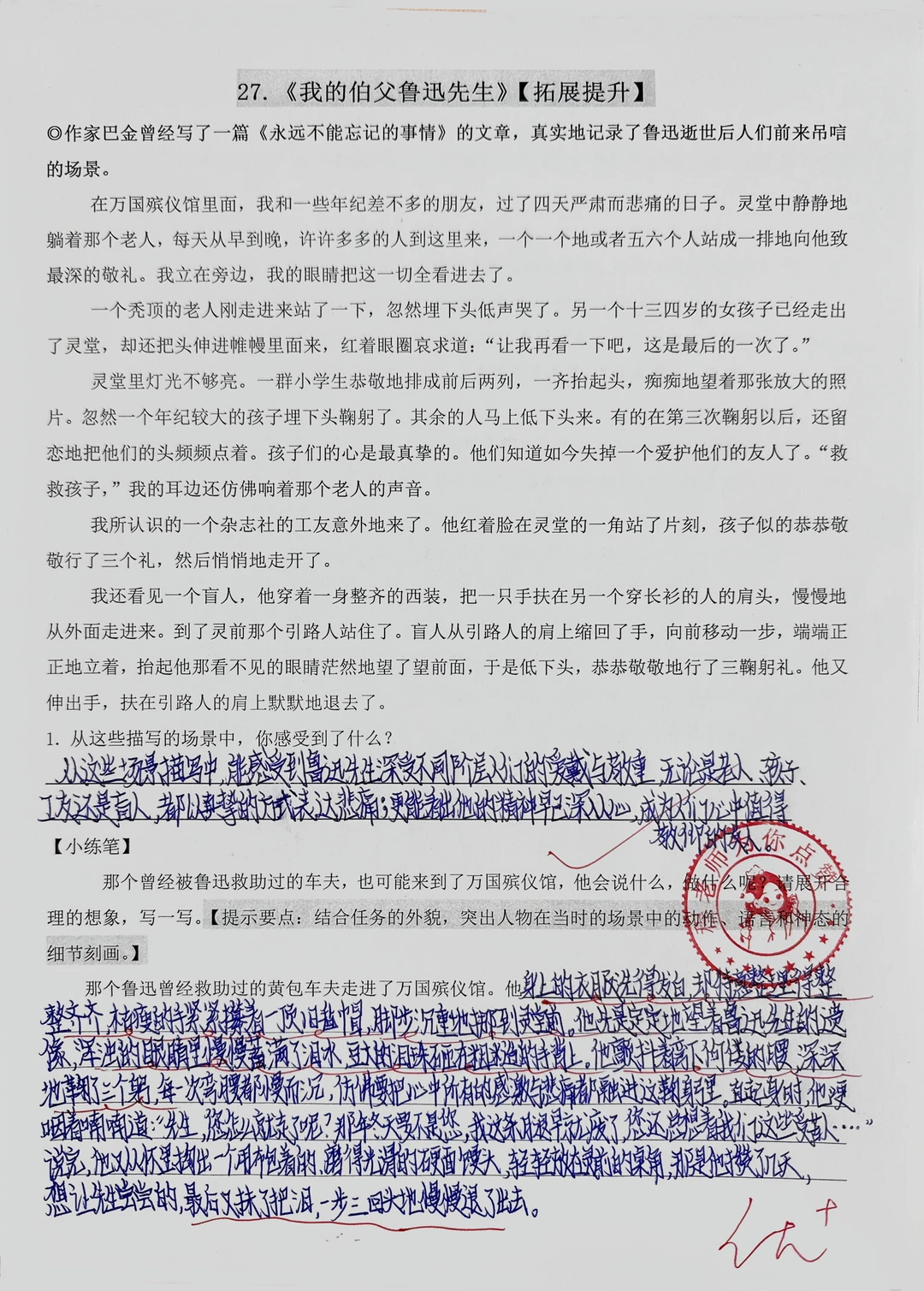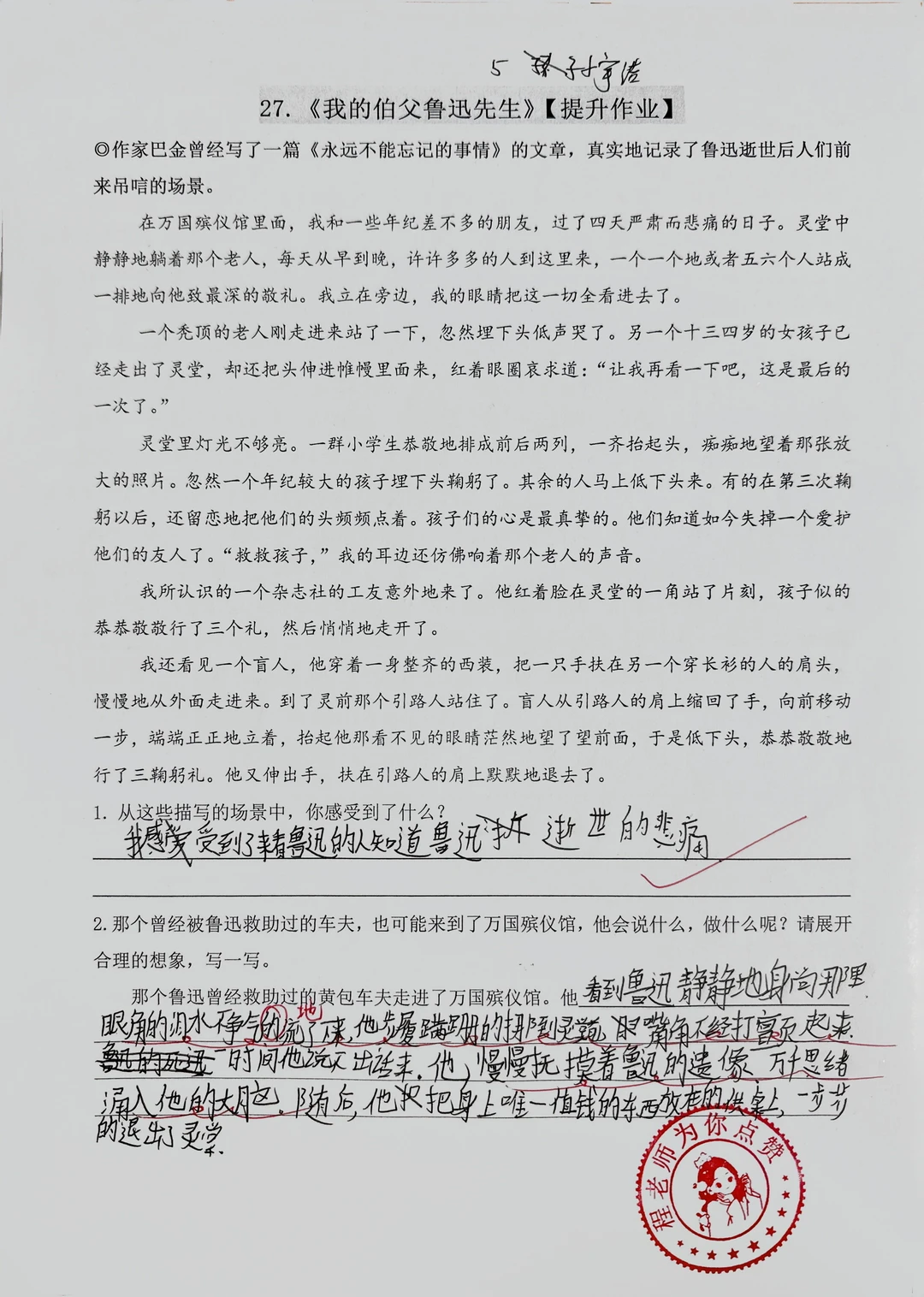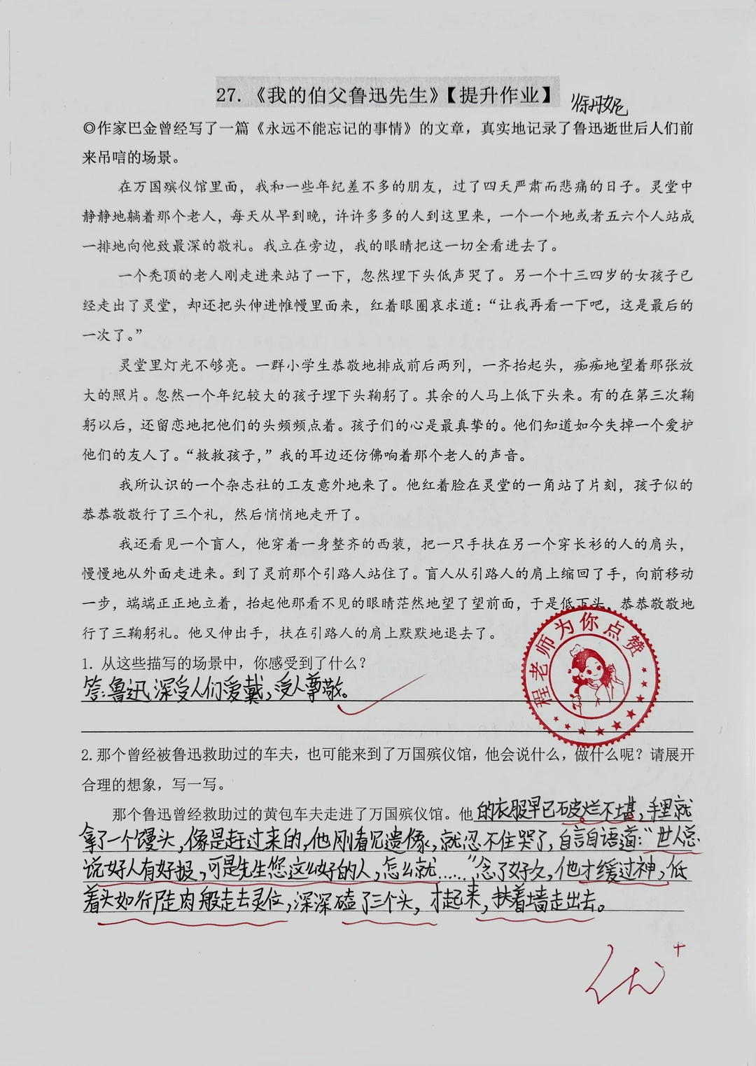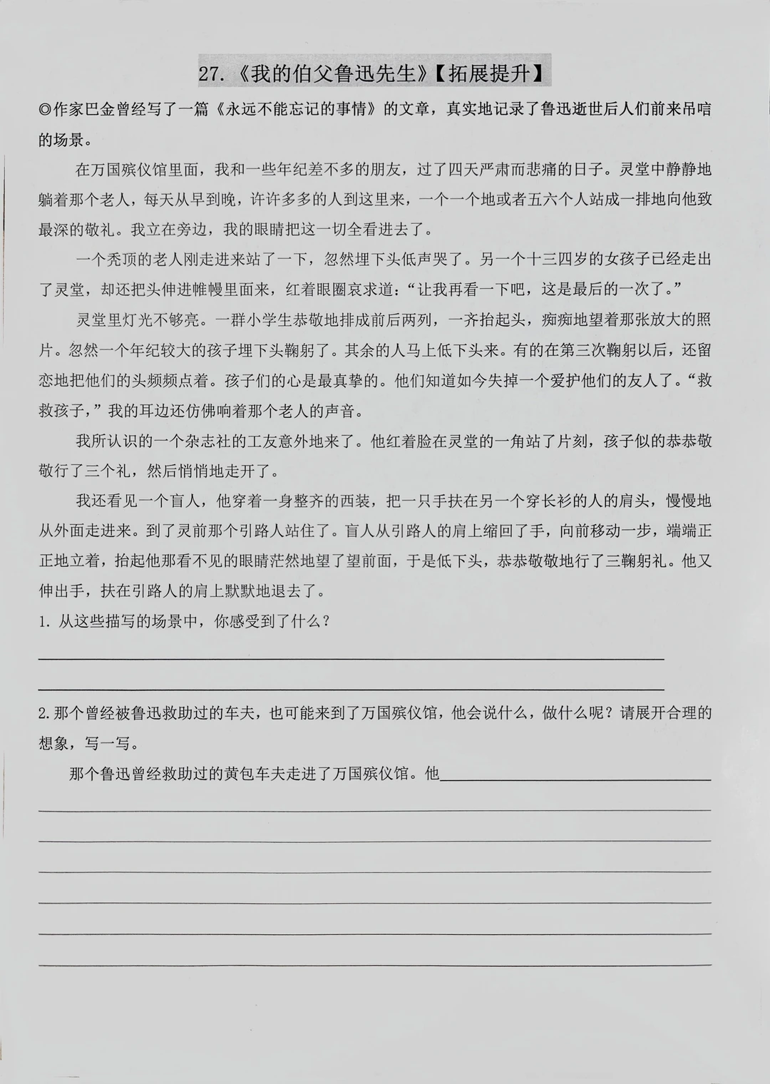 【展开想象写一写】 那个曾经被鲁迅救助过的车夫,也可能来到了万国殡仪馆,他会说什么,做什么呢?请展开合理的想象,写一写。 👉设计意图: 补充巴金文章的追悼场景,呼应开头“鲁迅受爱戴”的内容,强化情感共鸣; 设计车夫悼鲁迅的读写练习,衔接单元“通过事情写人表情感”的习作要求,实现阅读感悟向表达输出的转化,让人文体验与语言实践深度融合。 👇左下角可直接下载文件《我的伯父鲁迅先生》【拓展训练】