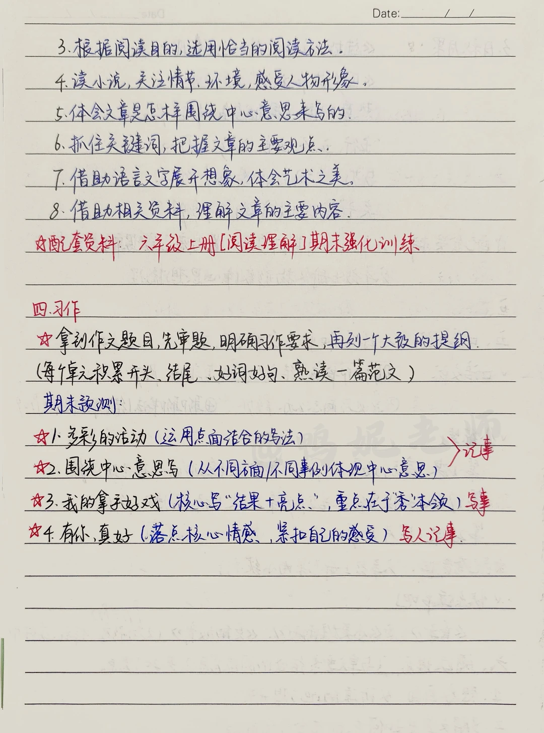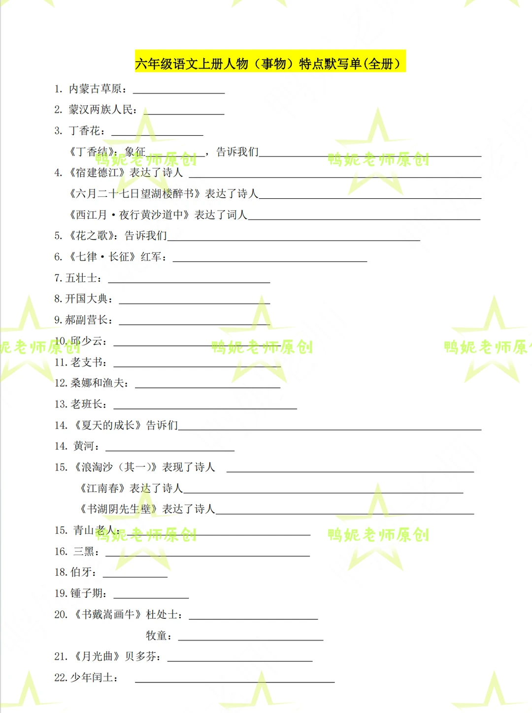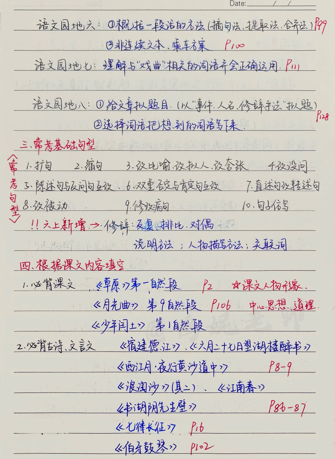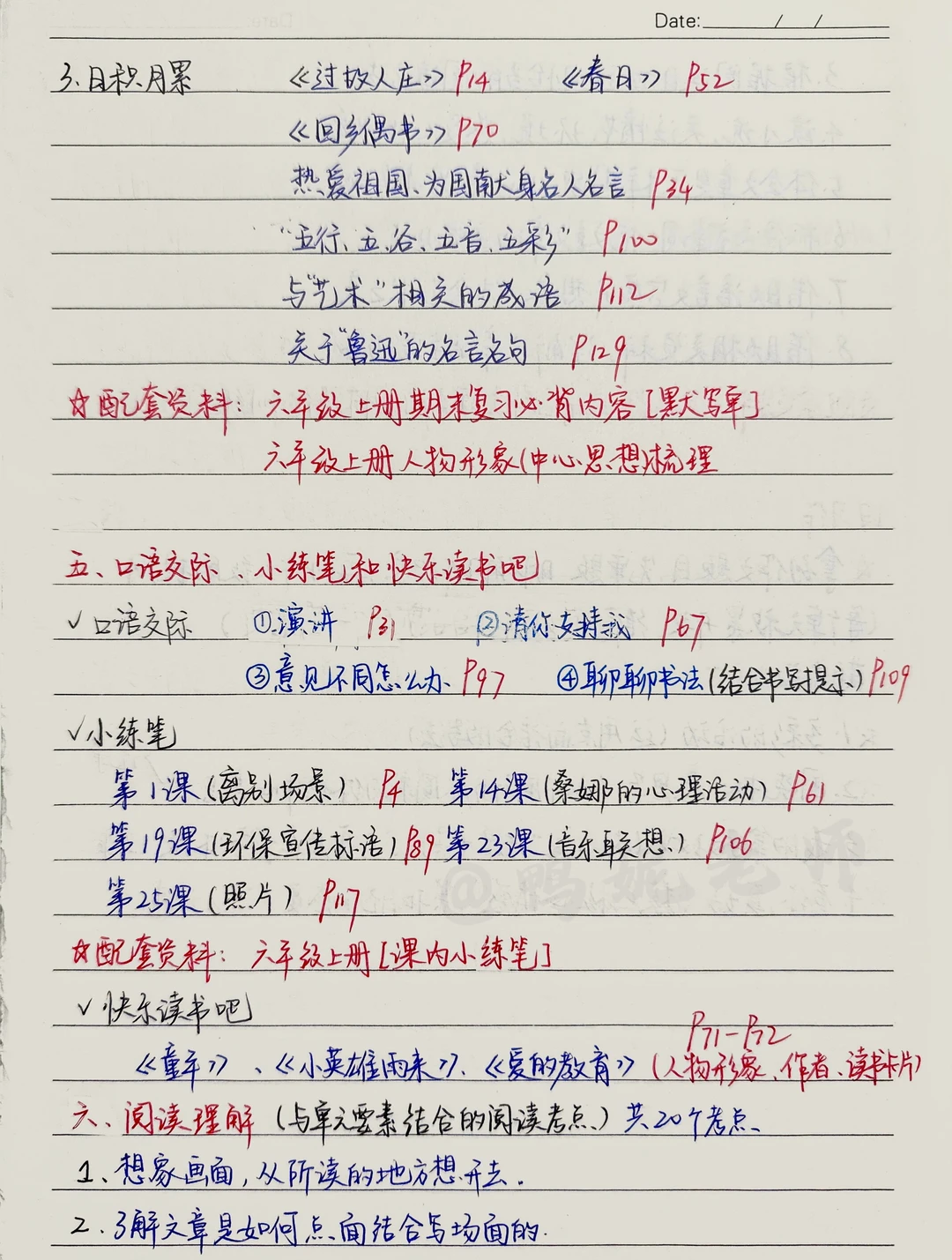 六年级上册语文期末复习计划来啦!现在可以着手给娃安排上期末复习冲刺了! 👉鸭妮老师详细整理了期末复习七大板块: [一R]字词基础 [二R]词句段运用 [三R]常考基础句型 [四R]根据课文内容填空 [五R]口语交际、小练笔和快乐读书吧 [六R]阅读理解 [七R]习作 👉根据高频考点整理的相关期末复习资料,助力孩子得高分!