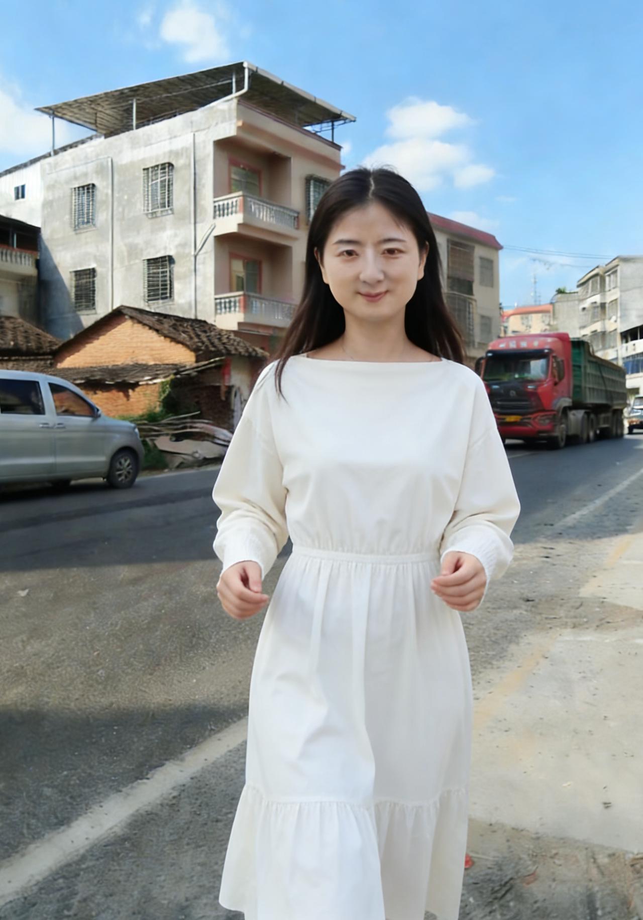 白裙飘飘暖风轻,街角楼头晓日明。 一笑嫣然尘俗外,恍如云影落边城。