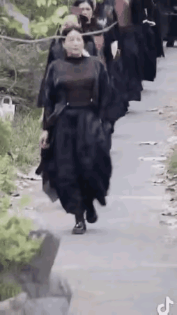 说真心话,真不好看,黑压压的一片,怪吓人的。 你说她们是走秀吧,她们好像是在乡村小路上,你说旅游吧,也不像啊,她们都穿一样的黑色衣裙,一字排开,一手插兜,行色匆匆,雄赳赳气昂昂的。 你说她们到底是干什么的呢?