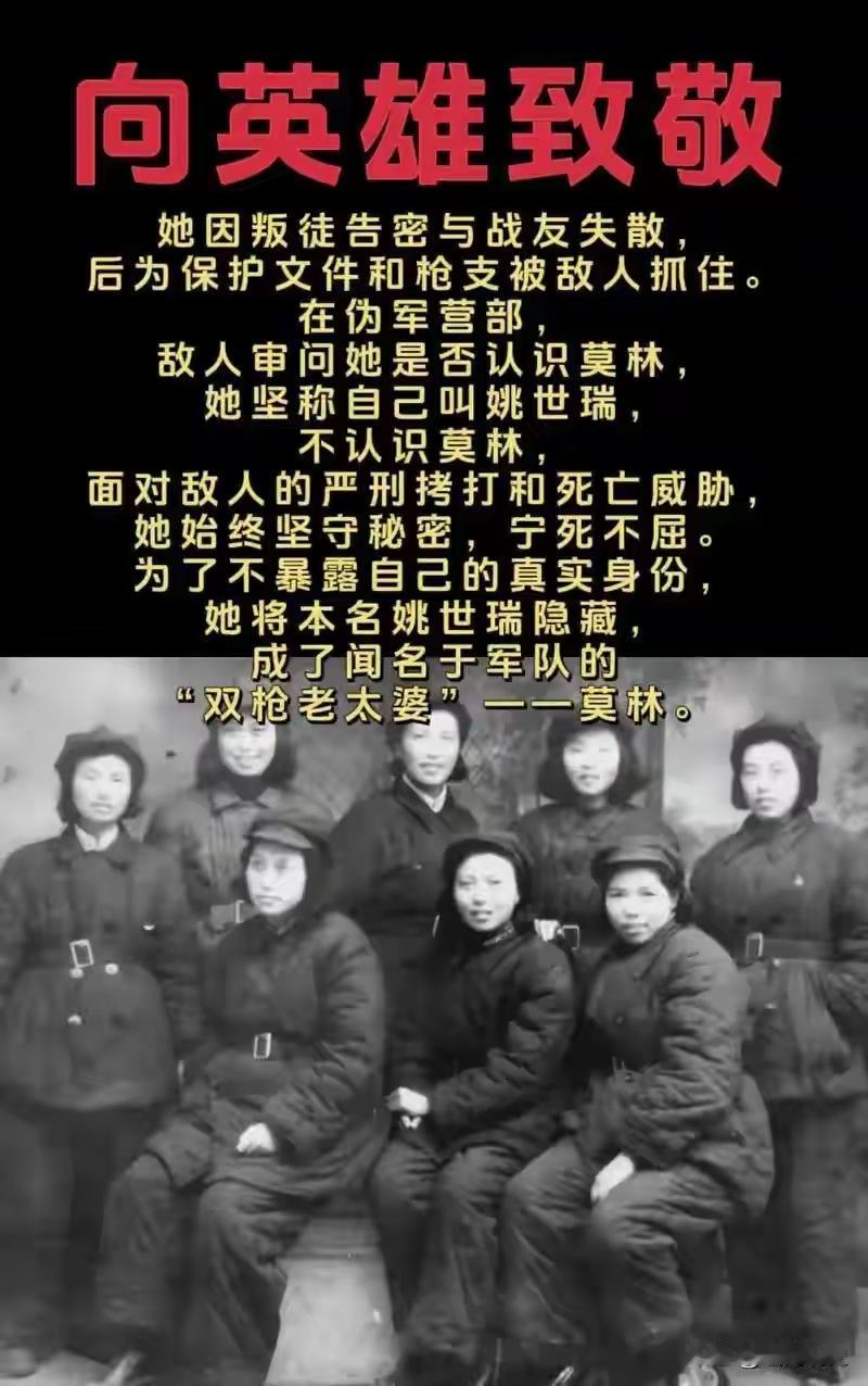 新四军女战士莫林被俘,她本打算赴死,谁知日军却问:莫林在哪? 1941年11月,如皋,21岁的姚世瑞刚把最后一页《民众识字课本》塞进文件袋,就吹熄油灯准备随部队转移。 她腰间别着两把德国造驳壳枪,头上裹着花头巾,身上穿件褪色棉袄,远远看去像个四十岁的农村大嫂。 老实讲,谁能想到这个“大嫂”,就是让日伪军忌惮到悬赏五万伪币买人头的“双枪老太婆”莫林。 夜色像浸了墨的棉絮,压得人喘不过气,如皋城外的田埂上满是冻土,踩上去咯吱作响。姚世瑞刚迈过一道沟渠,就听见身后传来杂乱的脚步声,还有日军叽里呱啦的喊叫和枪栓拉动的脆响——是“清剿队”摸上来了。她下意识按住腰间的驳壳枪,枪身冰凉的触感让她瞬间冷静,文件袋里的识字课本是给根据地百姓准备的,每一个字都藏着唤醒民众的力量,绝不能落入日军手里。 日军的手电光柱在黑暗中乱晃,照在她褪色的棉袄上,一个挎着军刀的日军军官走上前,用生硬的中文喝问:“莫林在哪?”姚世瑞心里咯噔一下,原来这群侵略者只闻其名,根本没见过她的真面目。她故意佝偻着背,揉了揉眼睛,操着一口地道的如皋方言嘟囔:“老总,啥子莫林?俺就是个种地的,夜里出来找跑丢的鸡。” 说话间,她悄悄把文件袋往身后的柴草堆里塞了塞,指尖触到粗糙的麦秸,想起半个月前,就是凭着这双手,她用驳壳枪撂倒了三个作恶的伪军,救下了被掳走的村姑。那时候她刚加入新四军不久,跟着队伍在如皋一带打游击,德国造驳壳枪是从日军手里缴获的,后座力大得很,第一次开枪时她的胳膊麻了三天,却硬是凭着一股韧劲练得百发百中。 日军军官显然不信,抬脚踢了踢她身边的柴草堆,“你的,不像农民!身上有枪味!”姚世瑞心里一紧,却故意咧嘴笑,露出一口黄牙:“老总说笑了,俺男人是打猎的,枪味沾身上洗都洗不掉。”她一边说一边往田埂深处退,腰间的驳壳枪已经上了膛,只要日军再逼近一步,她就打算拼个鱼死网破——自从投身抗日,她就没怕过死,只是不甘心没能把识字课本送到百姓手里。 旁边一个伪军凑上来,打量着她裹头巾的样子,低声对日军军官说:“太君,莫林是双枪女侠,听说年轻得很,这老太婆怕不是。”这话正好说到姚世瑞心坎里,她索性咳嗽起来,装作体弱的样子:“俺都四十好几了,哪能跟年轻姑娘比,老总们要是没事,俺就回家了。” 日军军官盯着她看了半晌,又看了看四周漆黑的田野,大概是怕遭遇游击队埋伏,最终挥了挥手:“走!”看着日伪军的身影消失在夜色中,姚世瑞才瘫坐在田埂上,冷汗把棉袄都浸湿了。她掏出文件袋,借着微弱的星光翻看,识字课本上的字迹还很清晰,“国家”“民族”“抗日”这些字眼,在黑暗中仿佛有了生命。 后来有人问她,当时怕不怕,姚世瑞总是说:“怕啥?俺身后是百姓,手里是枪,心里是家国。”那五万伪币的悬赏令,她不是没见过,贴在如皋城的墙上,画得面目全非,可她知道,那不是对她个人的悬赏,是对所有抗日志士的恐吓。在那个战火纷飞的年代,像她这样的女战士还有很多,她们褪去红妆,拿起武器,用青春和热血守护着这片土地。 姚世瑞的“双枪老太婆”之名,越传越广,日伪军闻风丧胆,百姓却视她为救星。她带着识字课本,走遍了如皋的村庄,教百姓认字,讲抗日的道理,很多年轻人受她影响,纷纷加入新四军。那些褪色的棉袄、破旧的头巾,都是她的伪装,也是她的铠甲,掩护着她在敌人的眼皮底下开展工作,传递着希望的火种。 革命先辈们用勇气和智慧对抗侵略者,用坚守和奉献守护家国,他们的故事不该被遗忘。正是因为有无数像姚世瑞这样的志士,在危难时刻挺身而出,才有了我们今天的和平生活。他们的精神,如同夜空中的星辰,永远照亮着我们前行的道路。 各位读者你们怎么看?欢迎在评论区讨论。