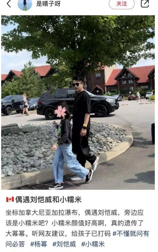 杨幂与刘恺威自 2018 年官宣结束近 5 年的感情后,双方便一直以亲人的身份共同抚养女儿小糯米。而近日,有网友就在社交媒体上贴出在加拿大偶遇刘恺威与小糯米的路透图,直呼小糯米的颜值是真的高~ 在被爆出的偶遇照片中,小糯米身穿灰色上衣搭配浅蓝色牛仔裤,爸爸刘恺威则跟在小糯米身后,如今已经 9 岁的小糯米身高已经到爸爸胸前,一双大长腿十分吸睛。该网友在发布刘恺威父女照片时表示照片拍摄地坐标于加拿大的尼亚加拉瀑布,还透露:“小糯米颜值好高啊,真的遗传了大幂幂”。 对于这次偶遇意外曝光了小糯米颜值,不少网友纷纷留言:“听小糯米同学的家长说和杨幂小时候长得超像,眼睛 blingbling 的很漂亮”、“之前在香港有见过,的确像大幂幂,不过我没有拍照!”、“基因真的很神奇,这张虽然打着码,但是走路身形超像杨幂” 等等。值得一提的是,后来有网友提醒楼主表示杨幂一直非常保护小糯米,不想孩子过多暴露于大众,所以还是建议楼主遮着孩子的模样,但目前该贴子疑似已经被,楼主隐藏,仅剩手快的网友截图流传于网络。