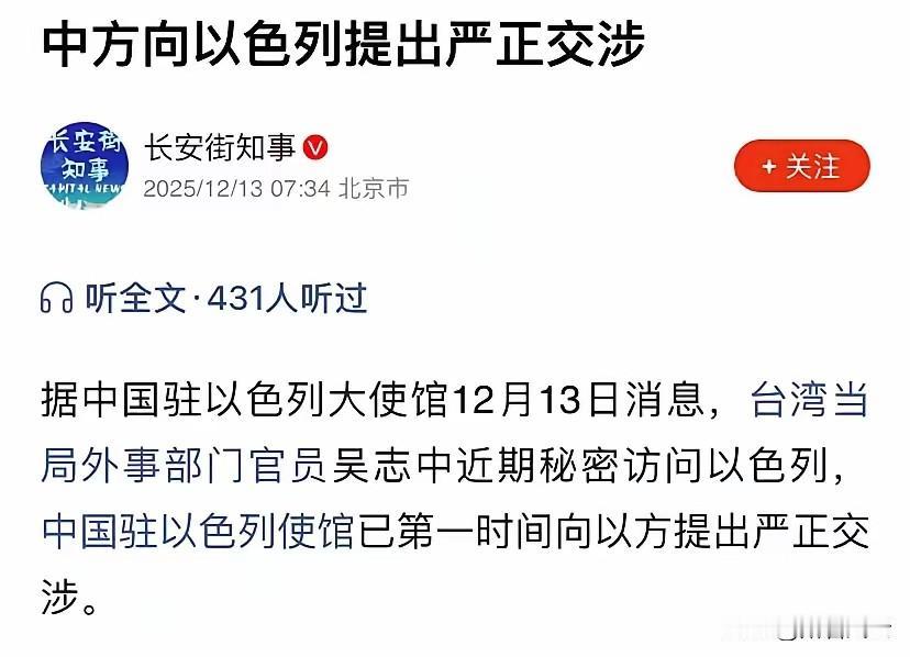 踩红线!台以勾连暴露野心,以色列这次太糊涂 台湾外事部门官员吴志中秘密窜访以色列的消息曝光,瞬间引爆舆论——这哪里是普通“访问”,分明是冲着以色列的先进防空技术来的,台岛绿营的“台独”野心,已经藏不住了! 今年以来,台当局不断铤而走险,如今竟敢勾结外部势力搞军事技术勾兑,而以色列的默许甚至配合,更是公然触碰一个中国原则的红线。世界上只有一个中国,台湾是中国不可分割的一部分,这是国际社会公认的事实,也是任何国家都不能逾越的底线。 以色列此举,不仅违背了与中国建交时的承诺,更沦为台当局分裂行径的帮凶。眼看它眼里只有美国的脸色,全然不顾基本的外交准则,真以为背靠美国就能肆意妄为?中国的红线绝不容踩踏,任何分裂国家的企图,最终只会碰得头破血流!