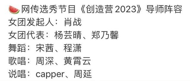不得不说,这一届网友很厉害请啊!都知道《创造营》即将捲土重来,只不过这一届不在中国国内办,反而放眼全亚洲,来个国际版的《创造营2023》啦! 《创造营2023》,也叫《CHUANG ASIA》,是WeTV和国际制作团队共同出品的选秀节目,第一篇章就在泰国开跑!主要聚集全亚洲的年轻人一起参赛,所以只要你符合条件就可以参加! 只要你是2008年之前出生的女生,没有国籍限制,就可以报名! 泰国WeTV也公开了报名链接。 这就来看,有网友爆出了这一届导师阵容!到底有谁呢?首先,女团发起人是…肖战! 女团代表有两位,都是来自泰国的艺人,也都是《创造营》出身的,包括了杨芸晴。 还有Nene郑乃馨! 舞蹈导师是也曾是二代女团代表的宋茜! 以及同样是女团出道的程潇! 歌唱导师则有周深 还有在《中国好声音》担任助教的黄霄云 说唱导师则有…Capper 以及我们熟悉的GAI周延 这就来看看网友发出来的名单 看完之后,有点莫名的感觉,也有不少肖战粉丝在线闢谣,虽然但是…万物皆有可能,毕竟,鹅爹始终是鹅爹,而《创造营》一向的口号,不就主打一个「敢」字吗!